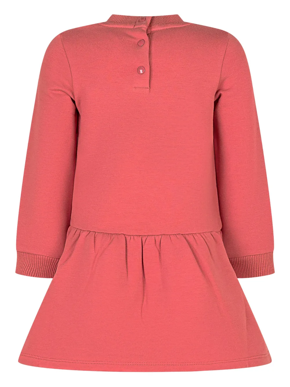 Расклешенная юбка с красным рисунком в виде сердца, длинные рукава, ребристые манжеты, застежка на пуговицы сзади.