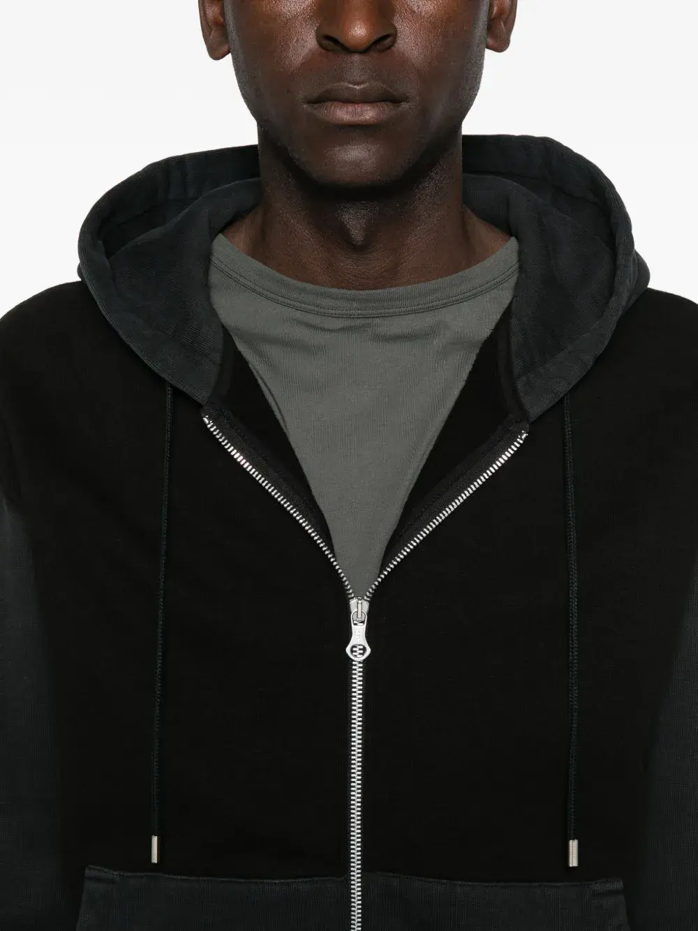 Черная застежка-молния, карман-кенгуру, длинные рукава.