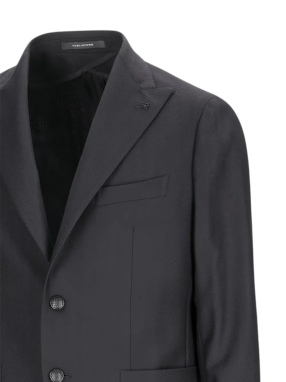 Темно-серый, с узором «ёлочка», застежкой на пуговицы, накладными карманами, острыми лацканами.