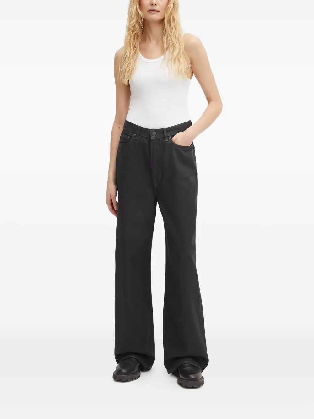 Черные широкие брюки с высокой талией, пятью карманами, застежкой на пуговицы, прямым подолом