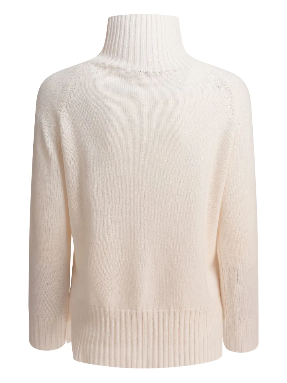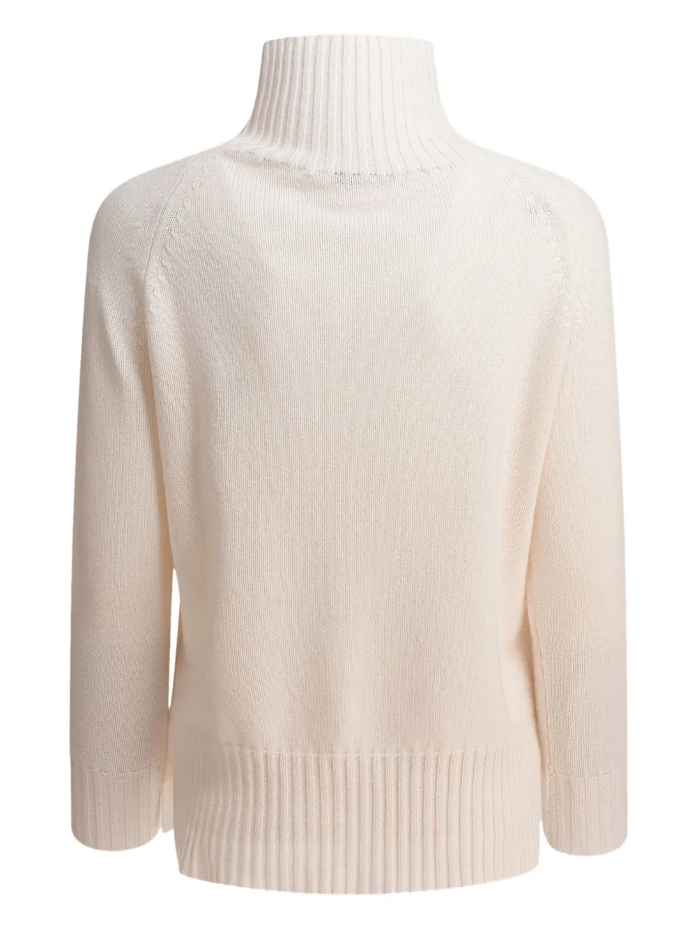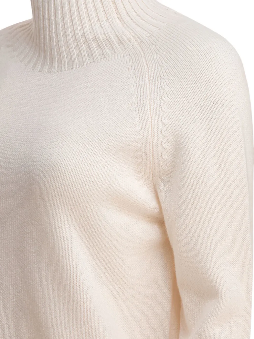 Белый кашемир с высоким воротом, длинными рукавами, ребристым подолом и ребристыми манжетами.