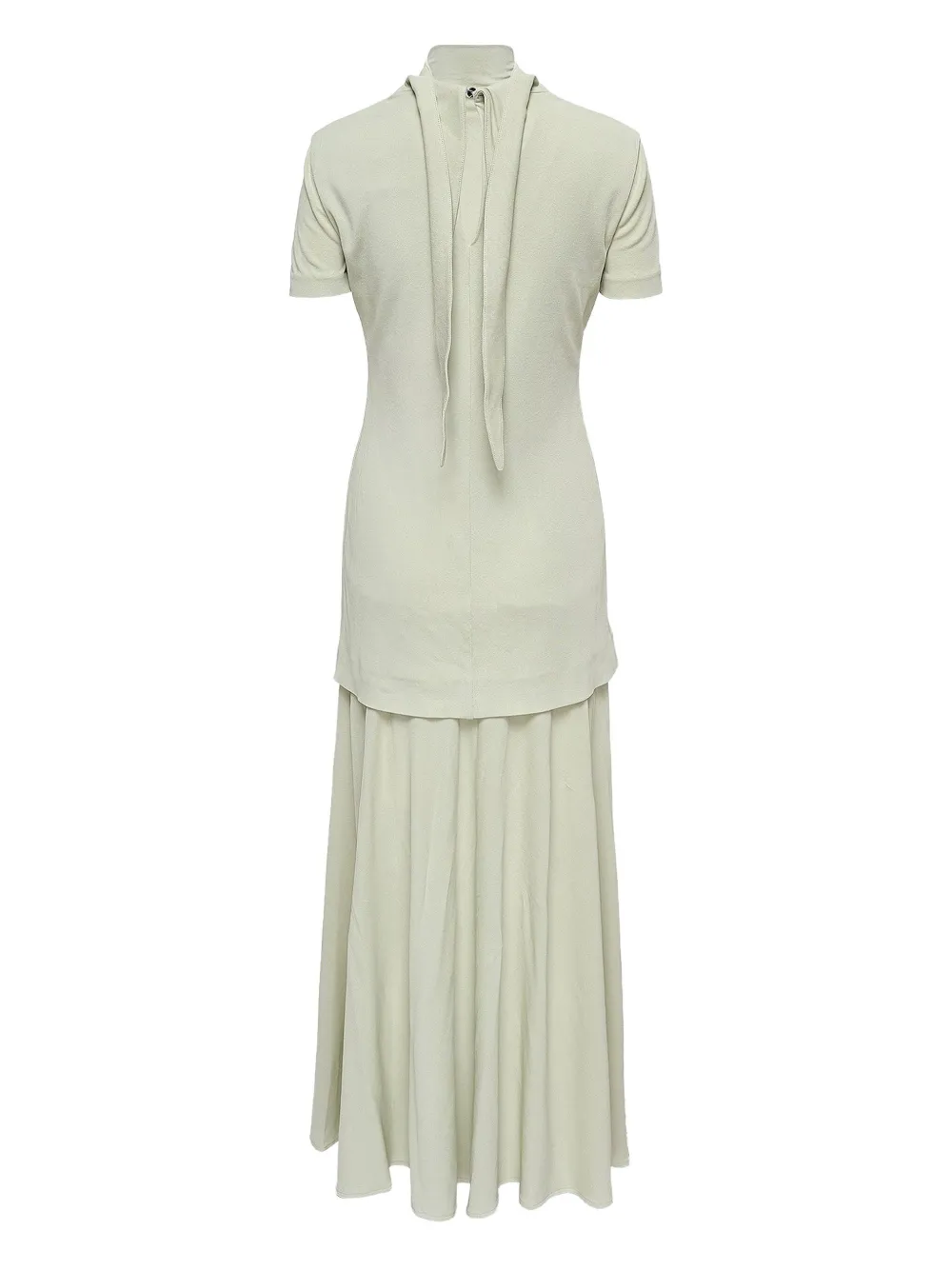 Юбка светло-зеленого цвета с высоким воротом, короткими рукавами, многослойными деталями и складками