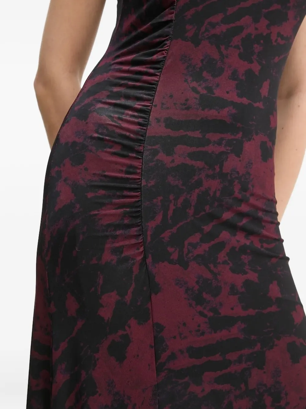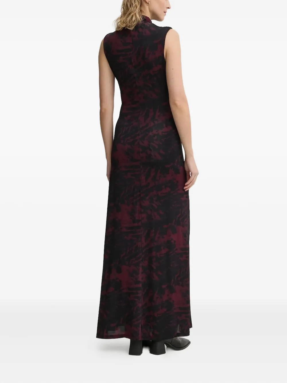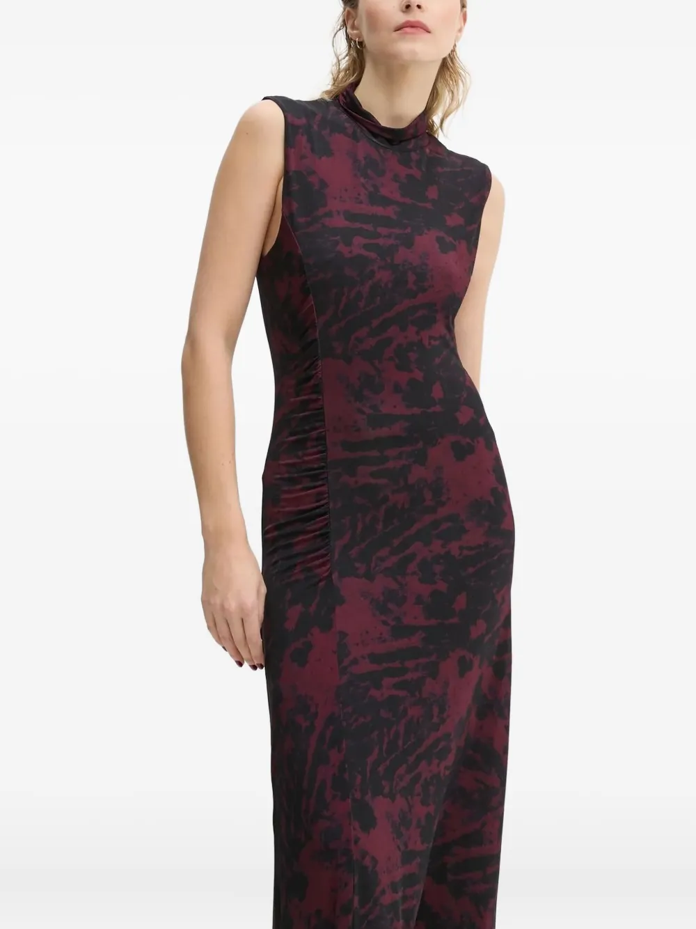 Платье без рукавов с абстрактным принтом бордового цвета, с высоким воротом, облегающим лифом и сборками по бокам.