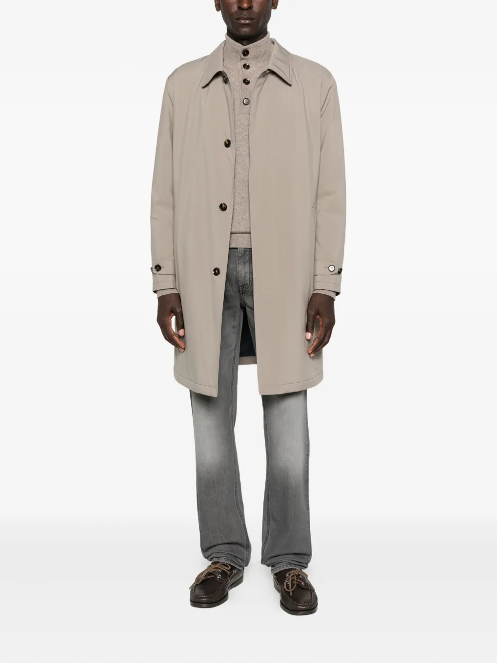 Бежевый, с высоким воротом, застежкой на пуговицы, длинными рукавами, прямым подолом.