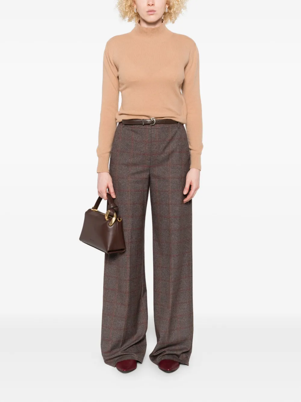Коричневый цвет, высокий ворот, длинные рукава, ребристые манжеты, прямой подол.