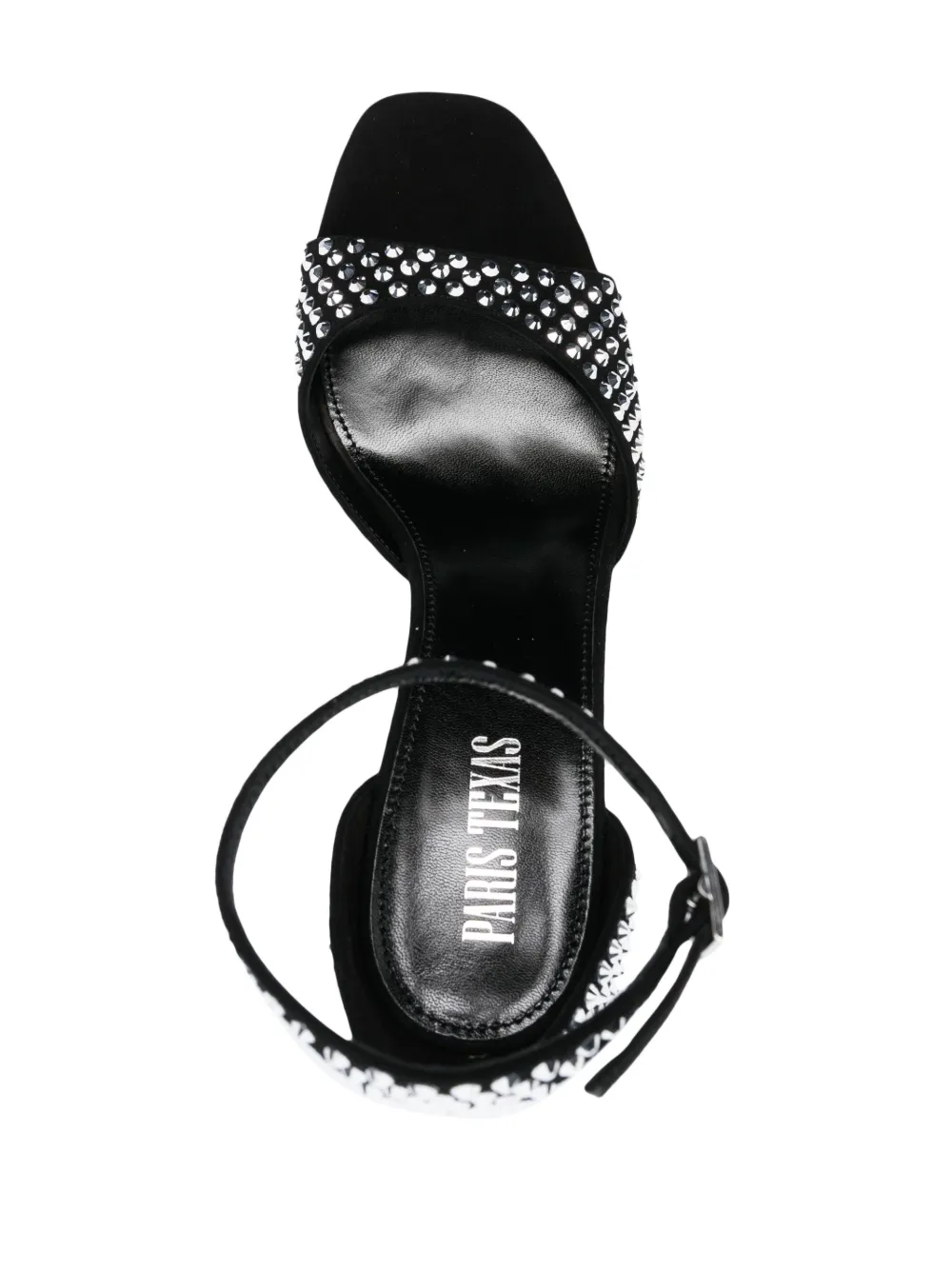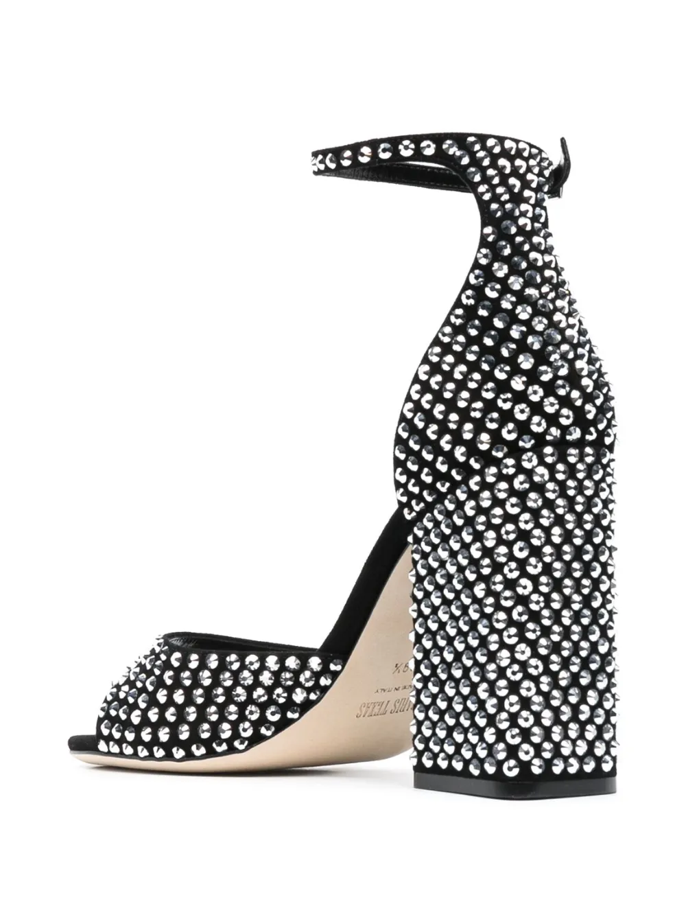 Черный, телячья кожа, декор из кристаллов, открытый носок, ремешок на щиколотке с пряжкой, стелька с логотипом и высокий блочный каблук.