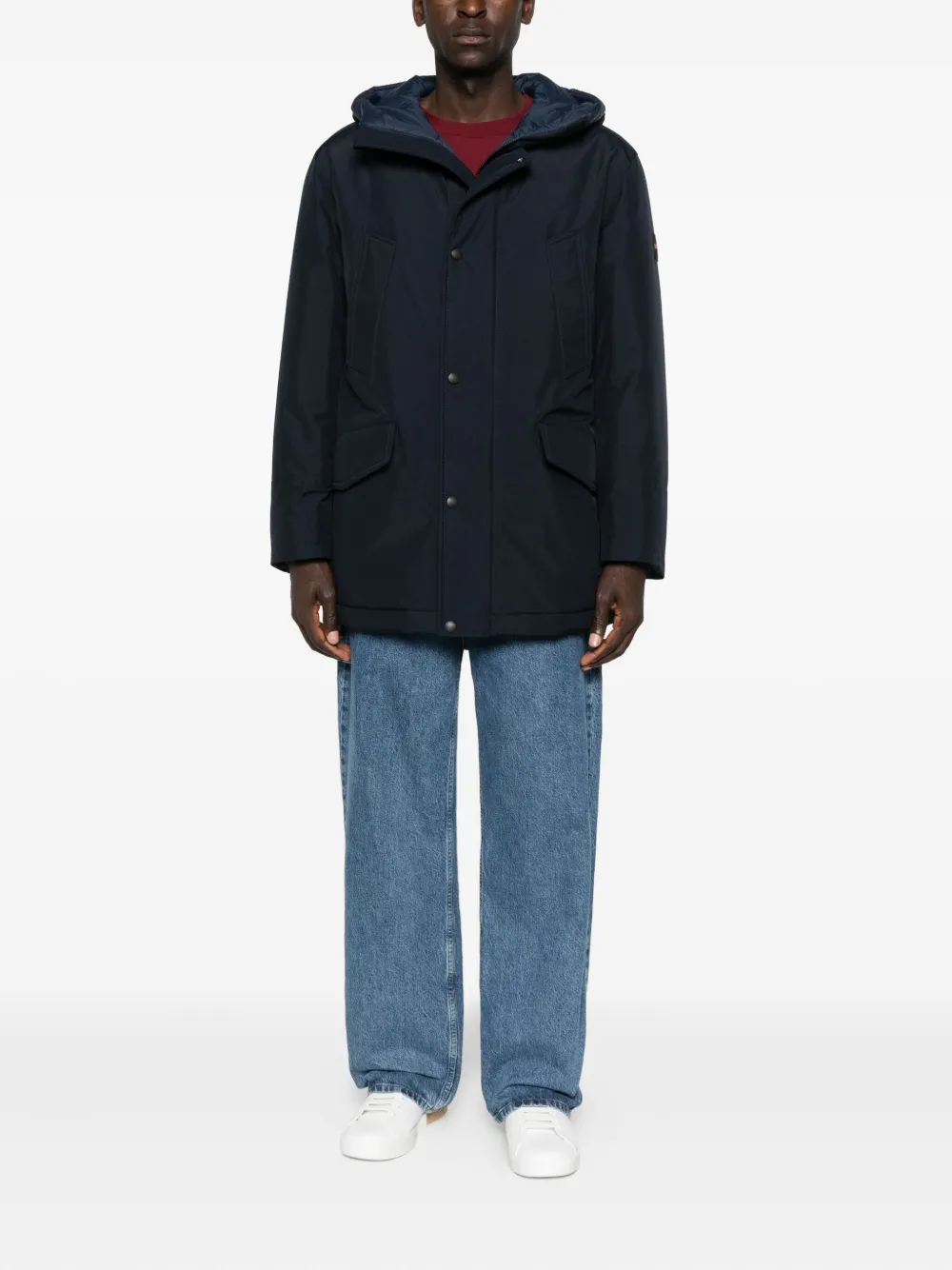 Темно-синий капюшон, застежка на пуговицы, карманы с клапанами, нашивка с логотипом