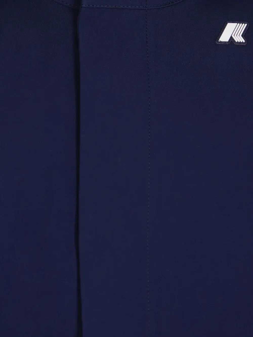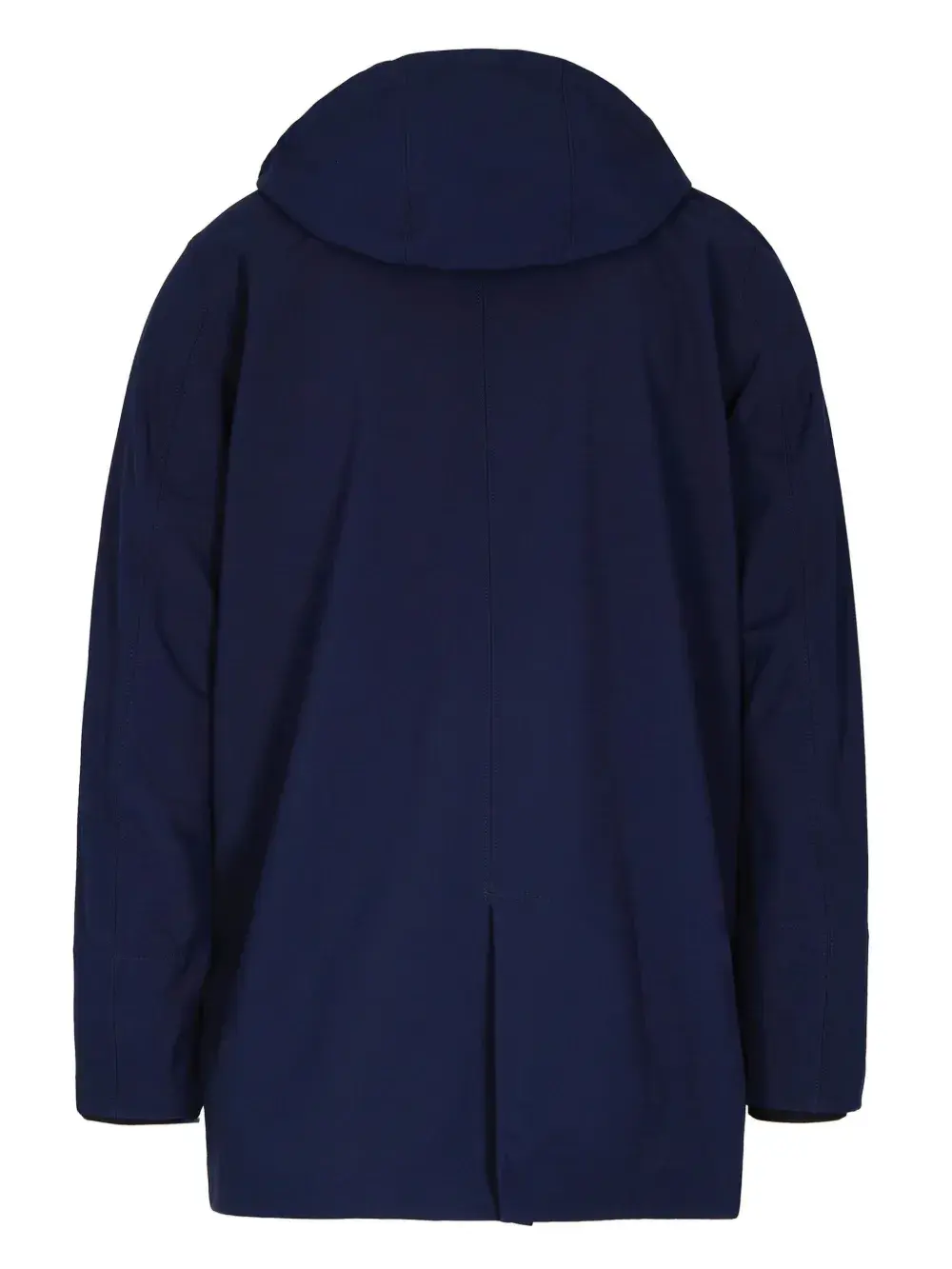 Темно-синяя потайная застежка-молния, пришитый капюшон, длинные рукава, нашивка с логотипом, прямой подол.