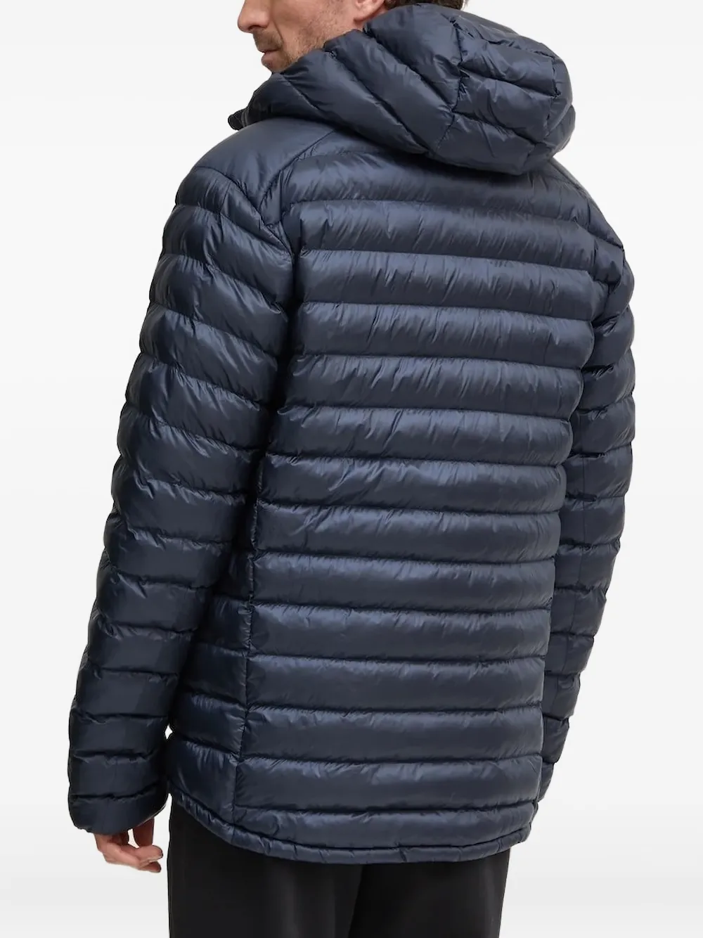 Темно-синий горизонтальный стеганый дизайн, застежка-молния по всей длине, пришитый капюшон, вышитый логотип, длинные рукава