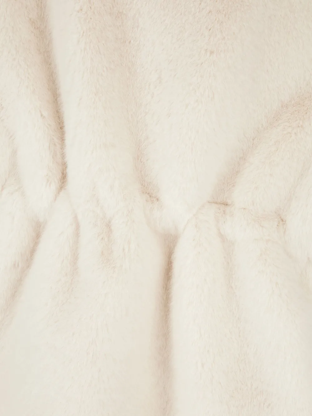Капюшон из искусственного меха кремового цвета, воротник, затянутая талия, потайная застежка спереди, длинные рукава.