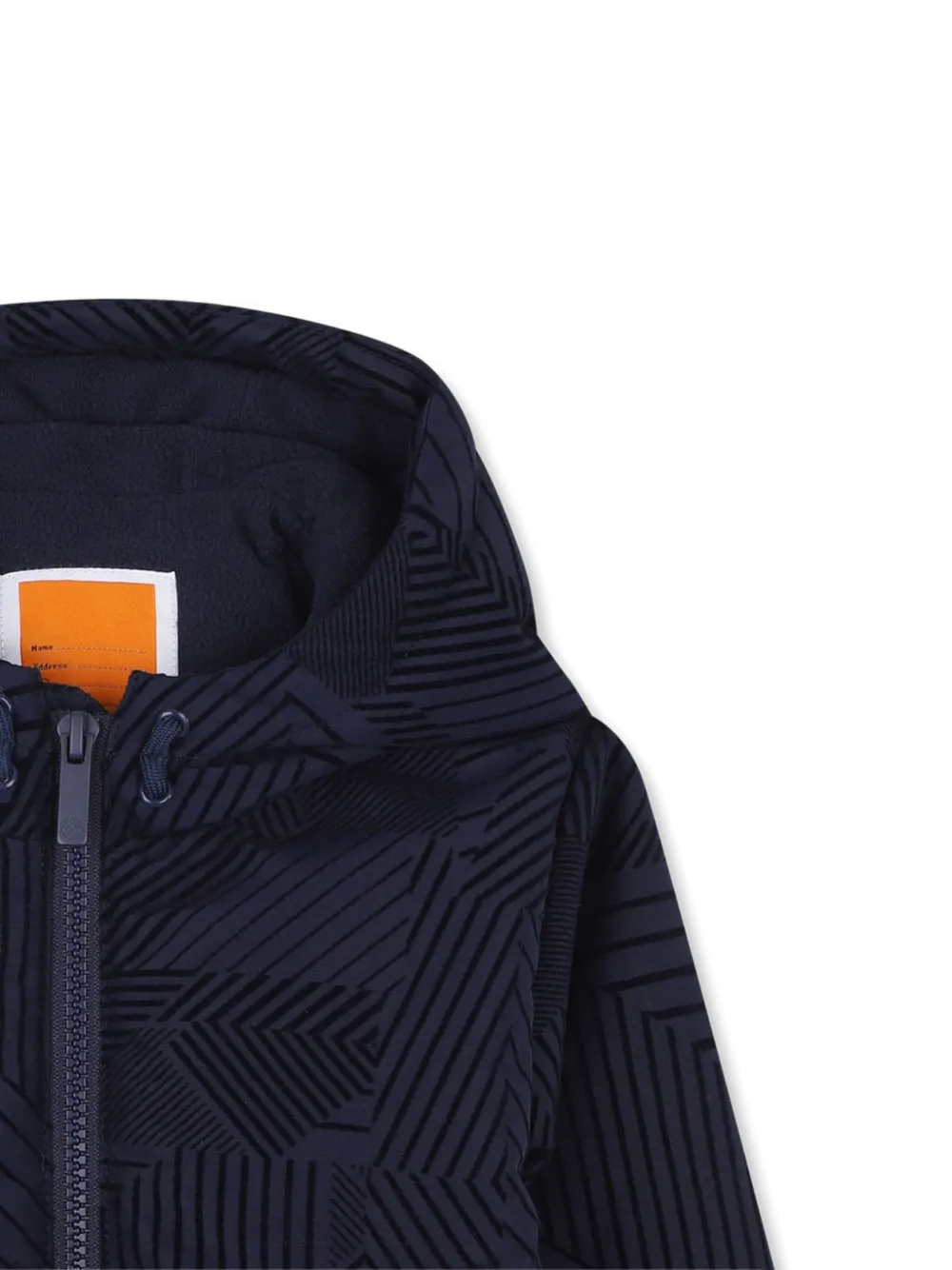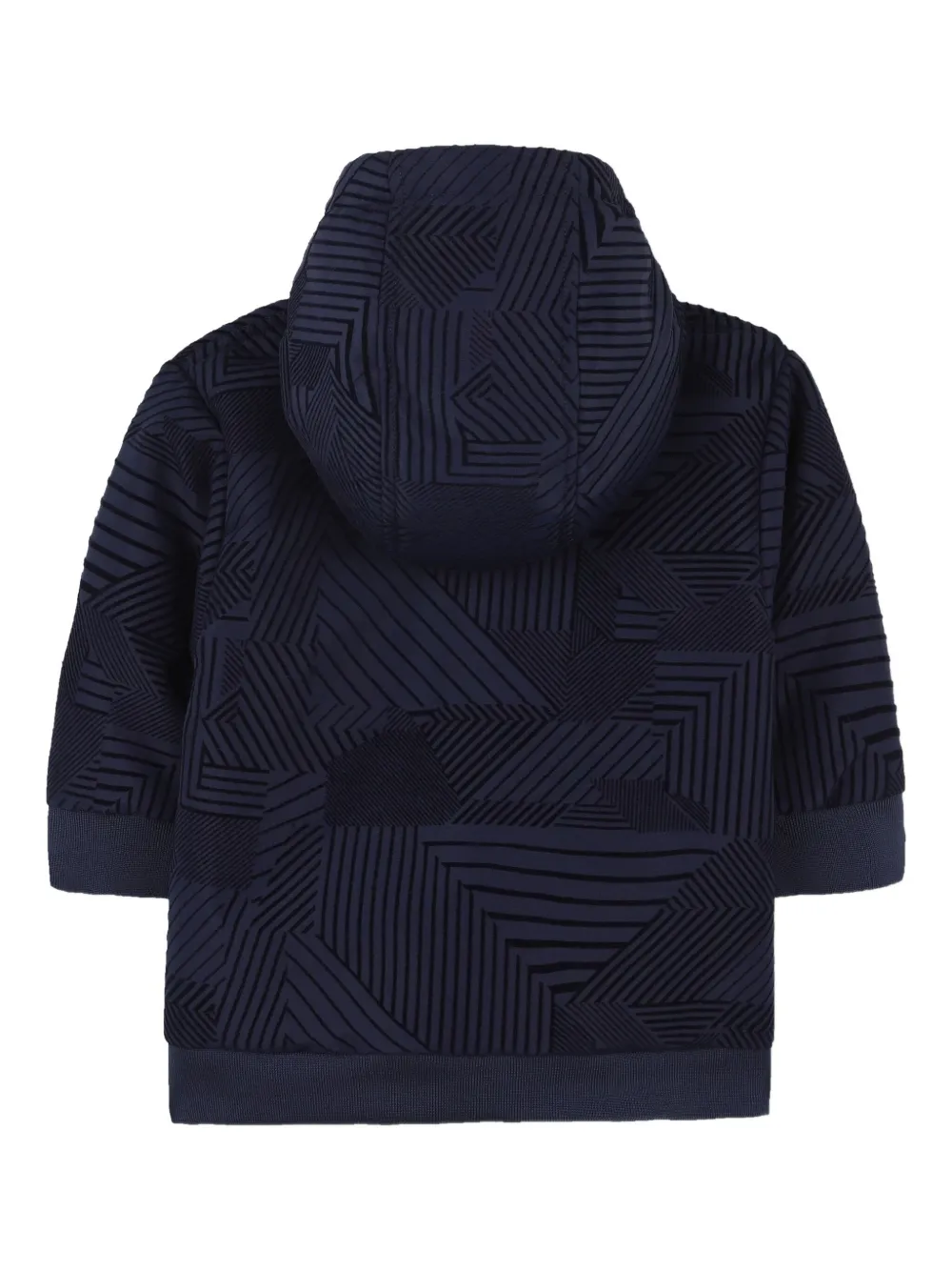Темно-синий геометрический узор, застежка-молния, капюшон на флисовой подкладке, ребристые манжеты, прорезные карманы