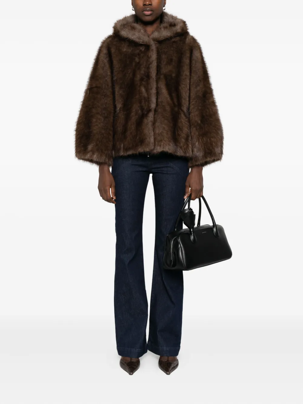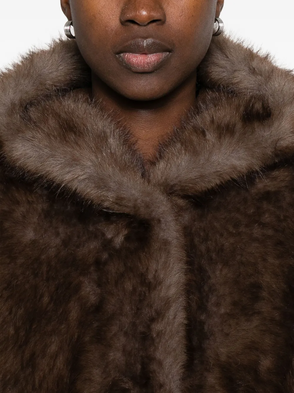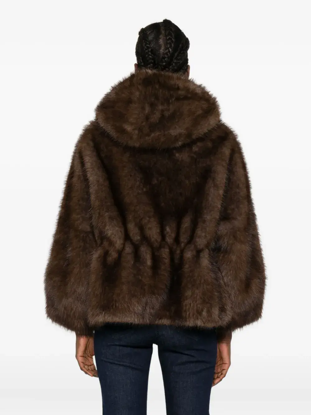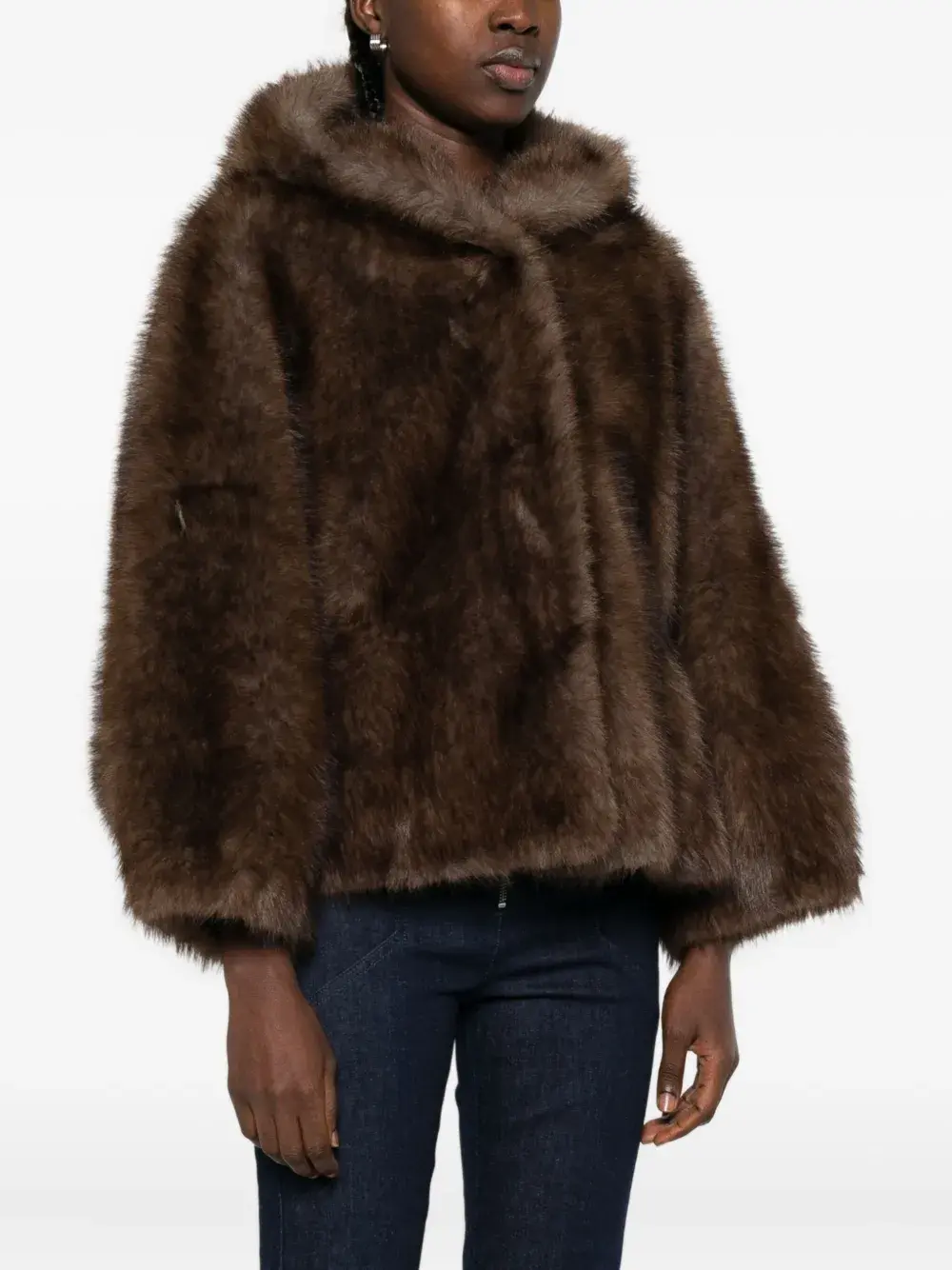 Коричневый капюшон, потайная застежка, длинные рукава.
