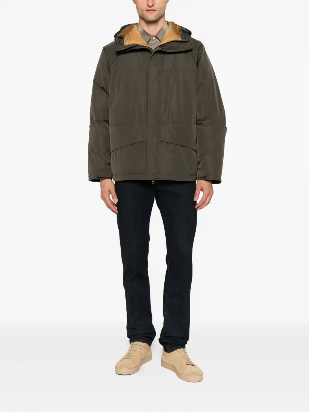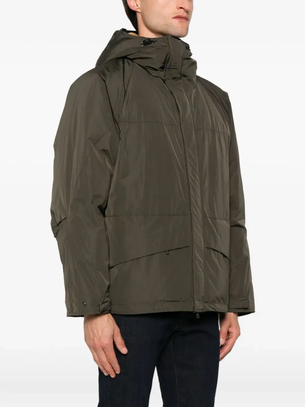 Зеленый утепленный дизайн, капюшон, застежка-молния, длинные рукава, несколько карманов.