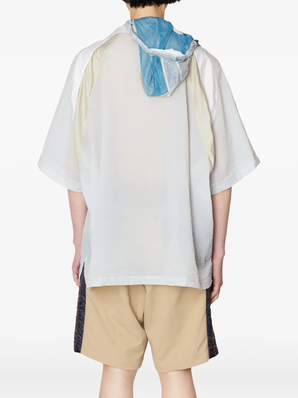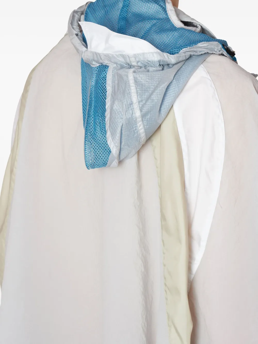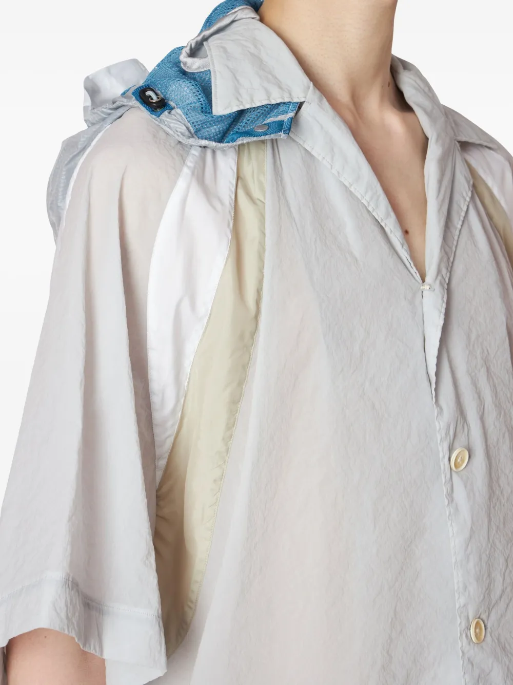 Светло-серый пришитый капюшон, короткие рукава, застежка на пуговицы.