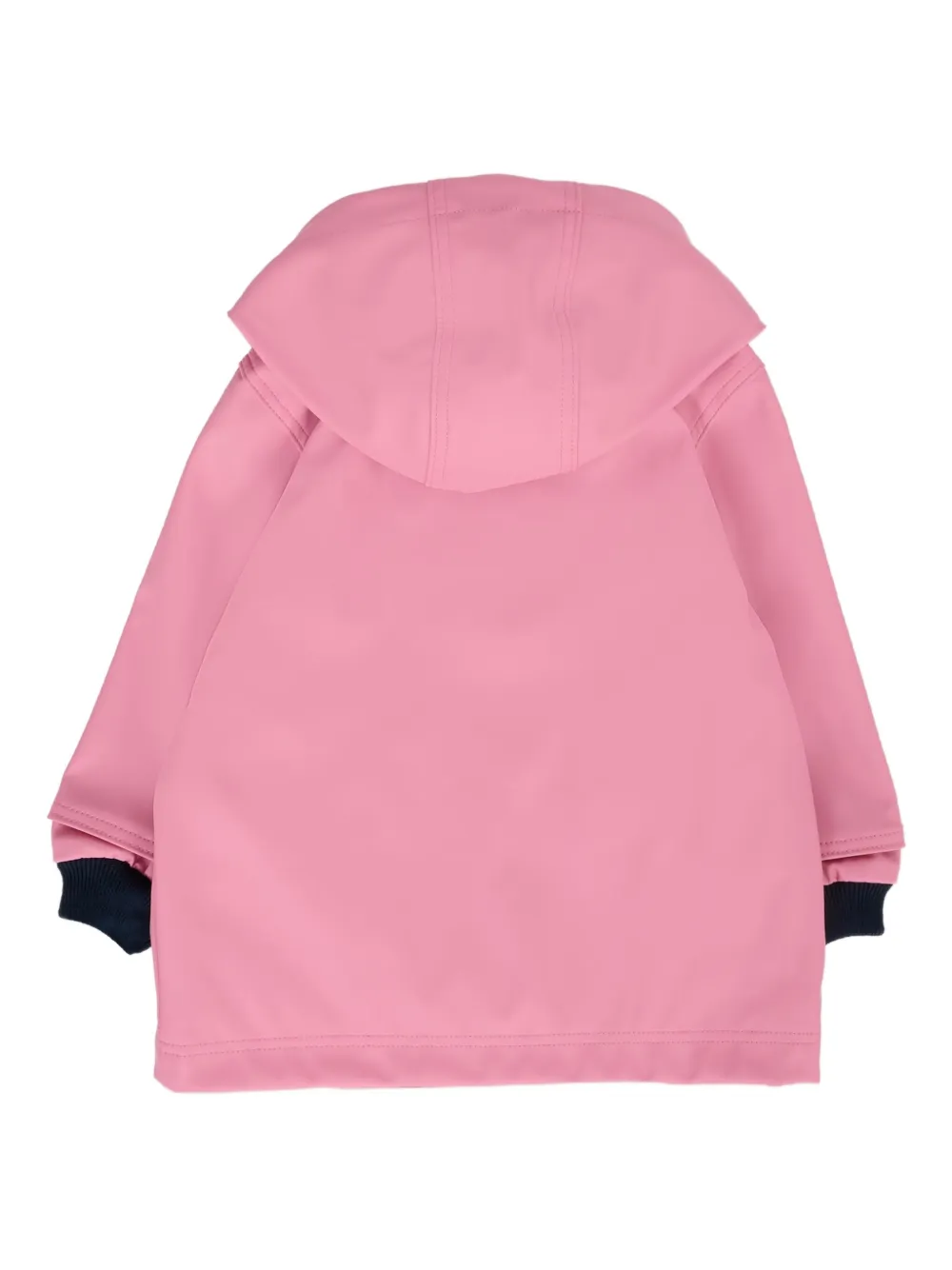 Розовый капюшон, два накладных кармана, застежка на пуговицы, ребристые манжеты, водонепроницаемая ткань.