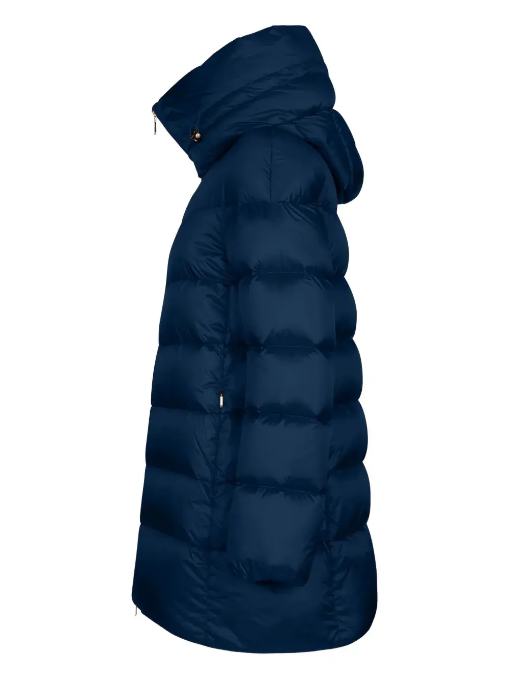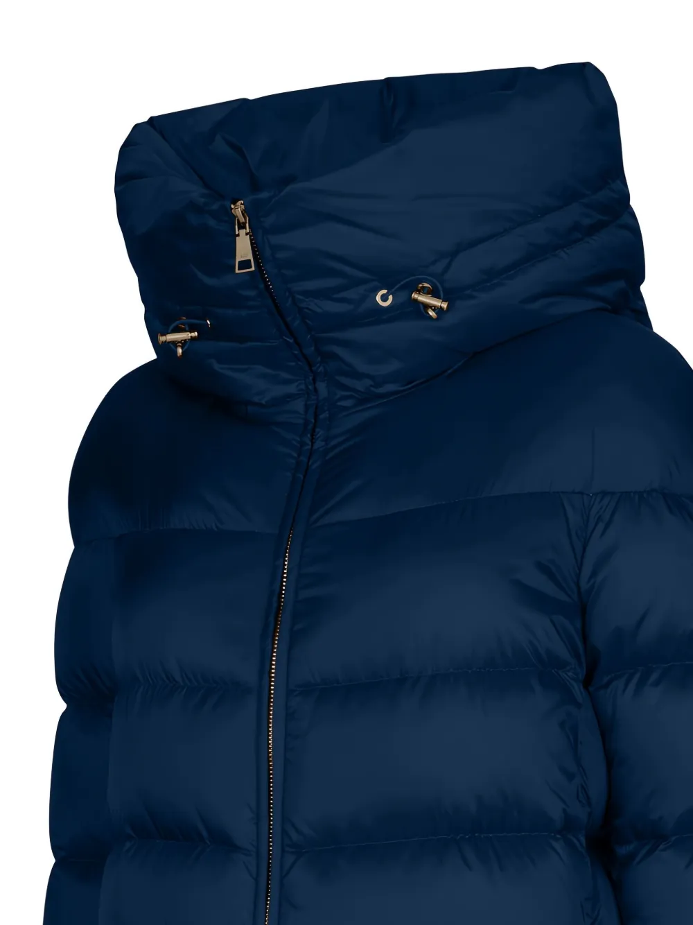 Темно-синий, высокий воротник, стеганая застежка-молния, капюшон на шнурке, длинные рукава