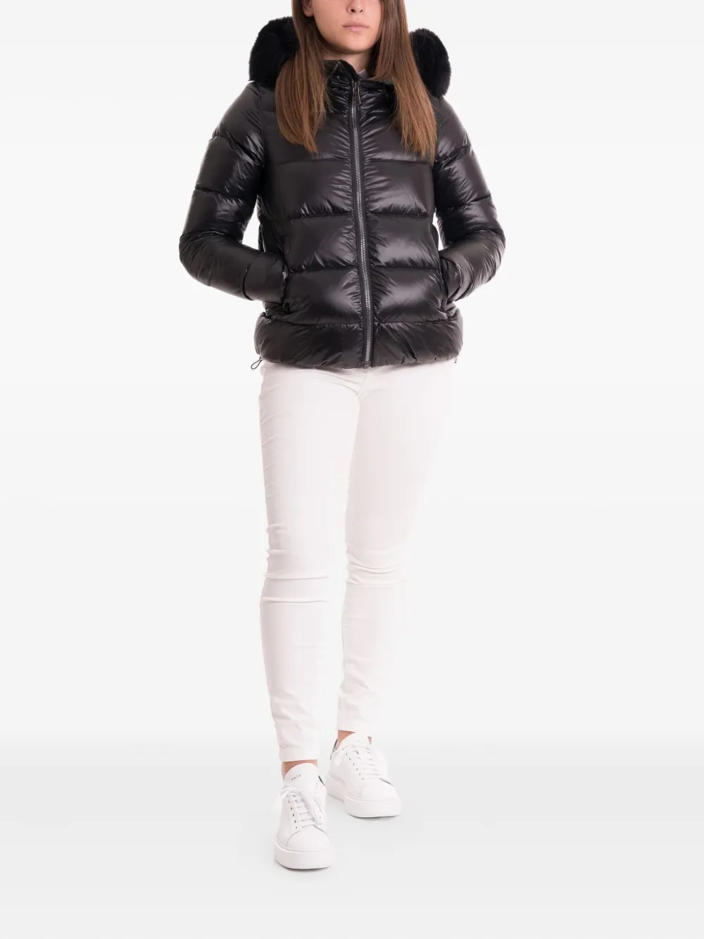 Черная блестящая стеганая куртка, съемный капюшон, отделка из искусственного меха, застежка-молния.