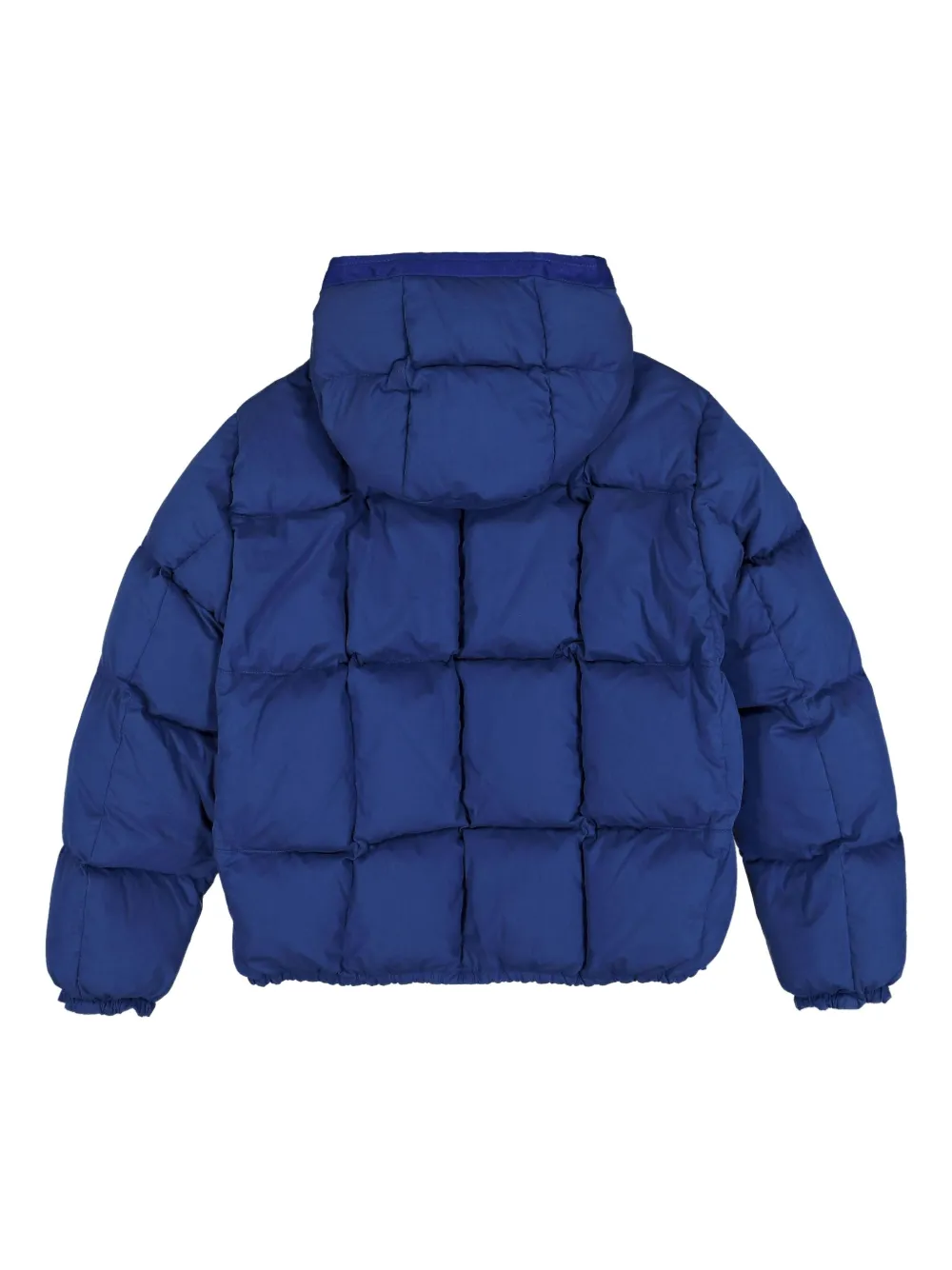 Синий стеганый дизайн, лямки с пряжками, длинная молния, капюшон, эластичные манжеты.
