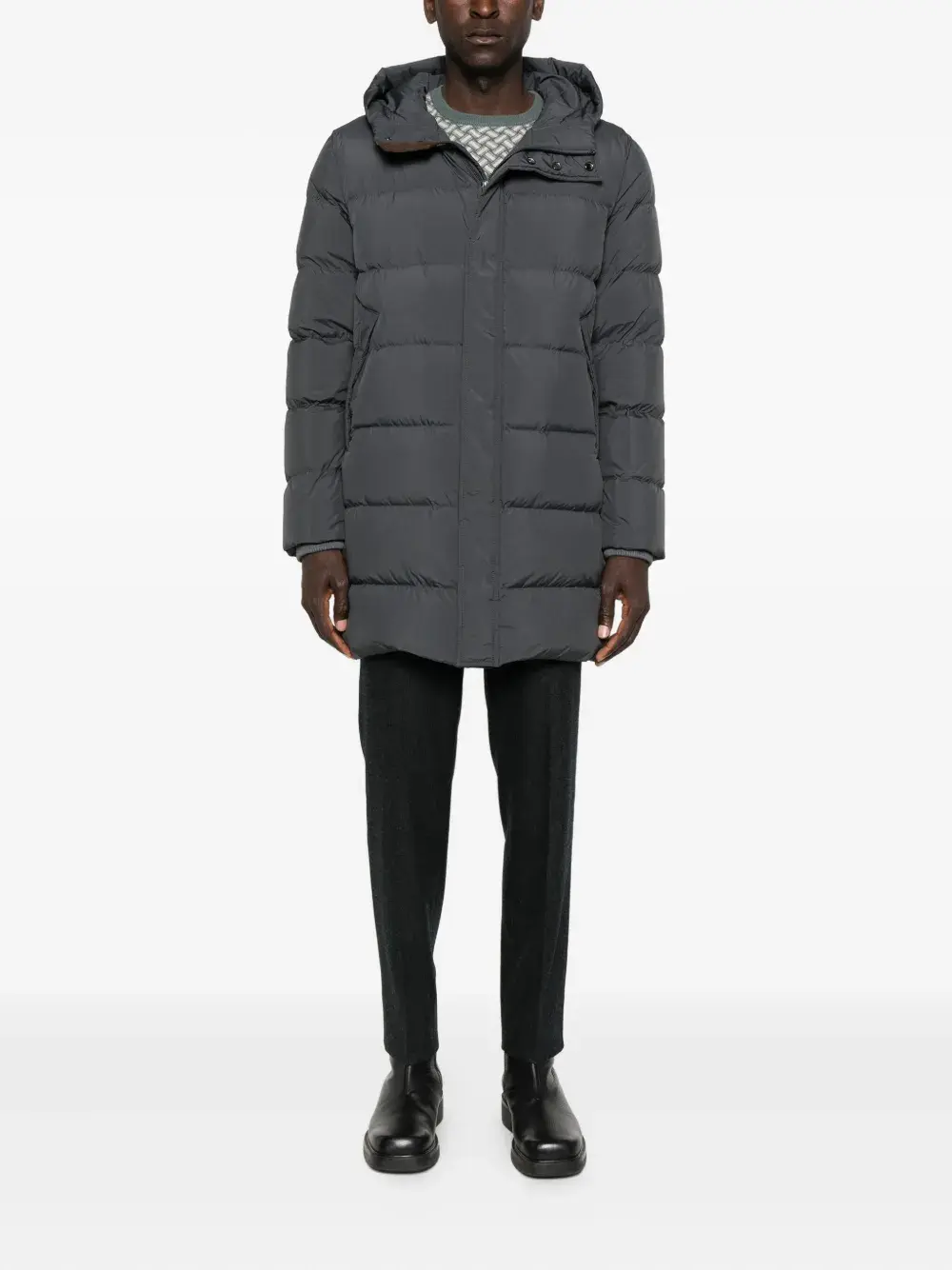 Темно-серый стеганый дизайн, капюшон, потайная застежка спереди, длинные рукава, два прорезных кармана.