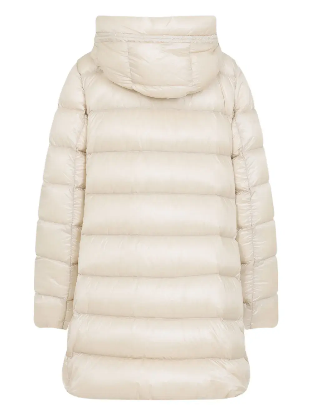 Светло-бежевый стеганый дизайн, капюшон, застежка-молния, длинные рукава, прямой подол.