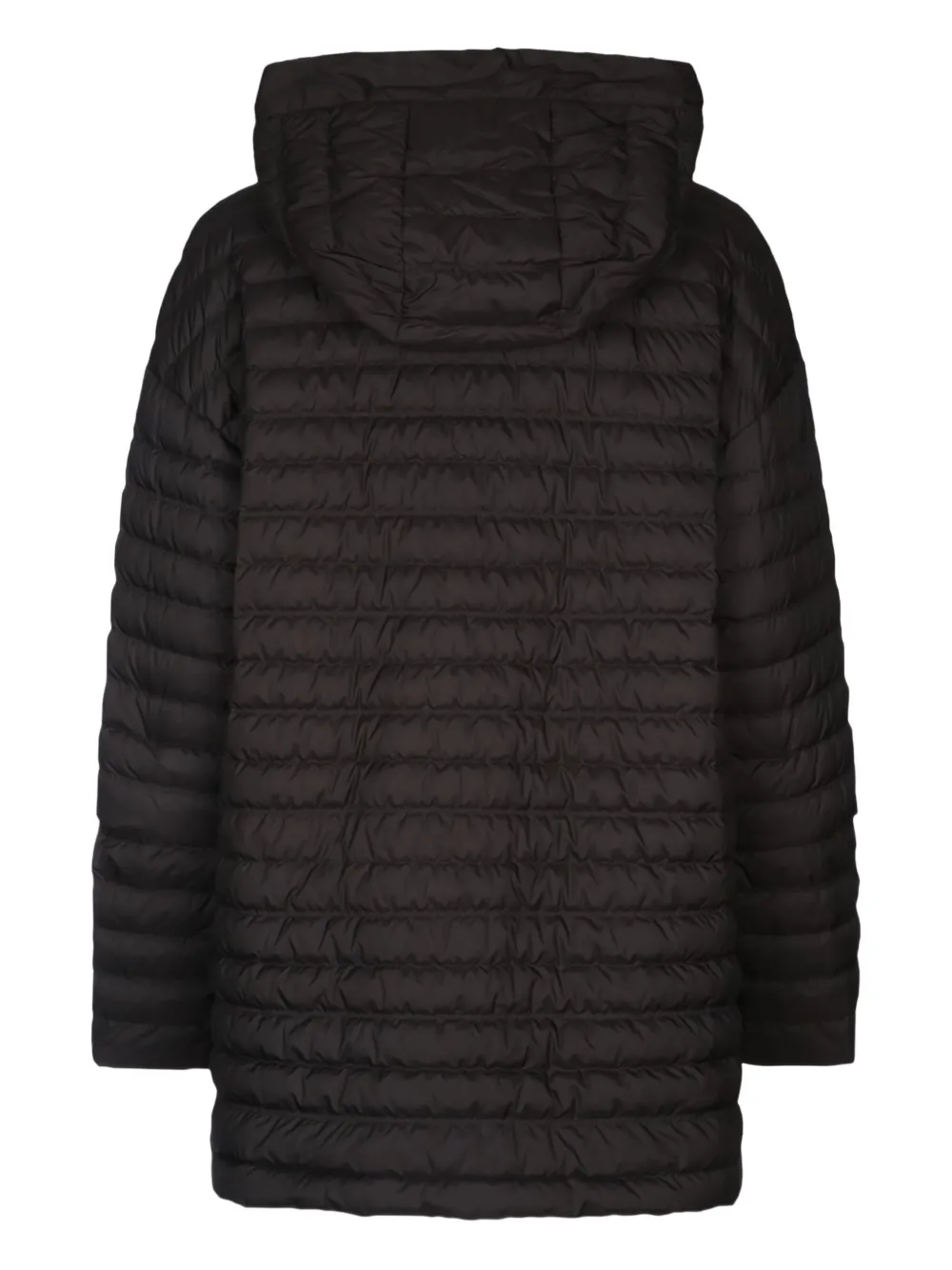 Черная стеганая модель с капюшоном, застежкой на кнопки и длинными рукавами, прямым подолом.