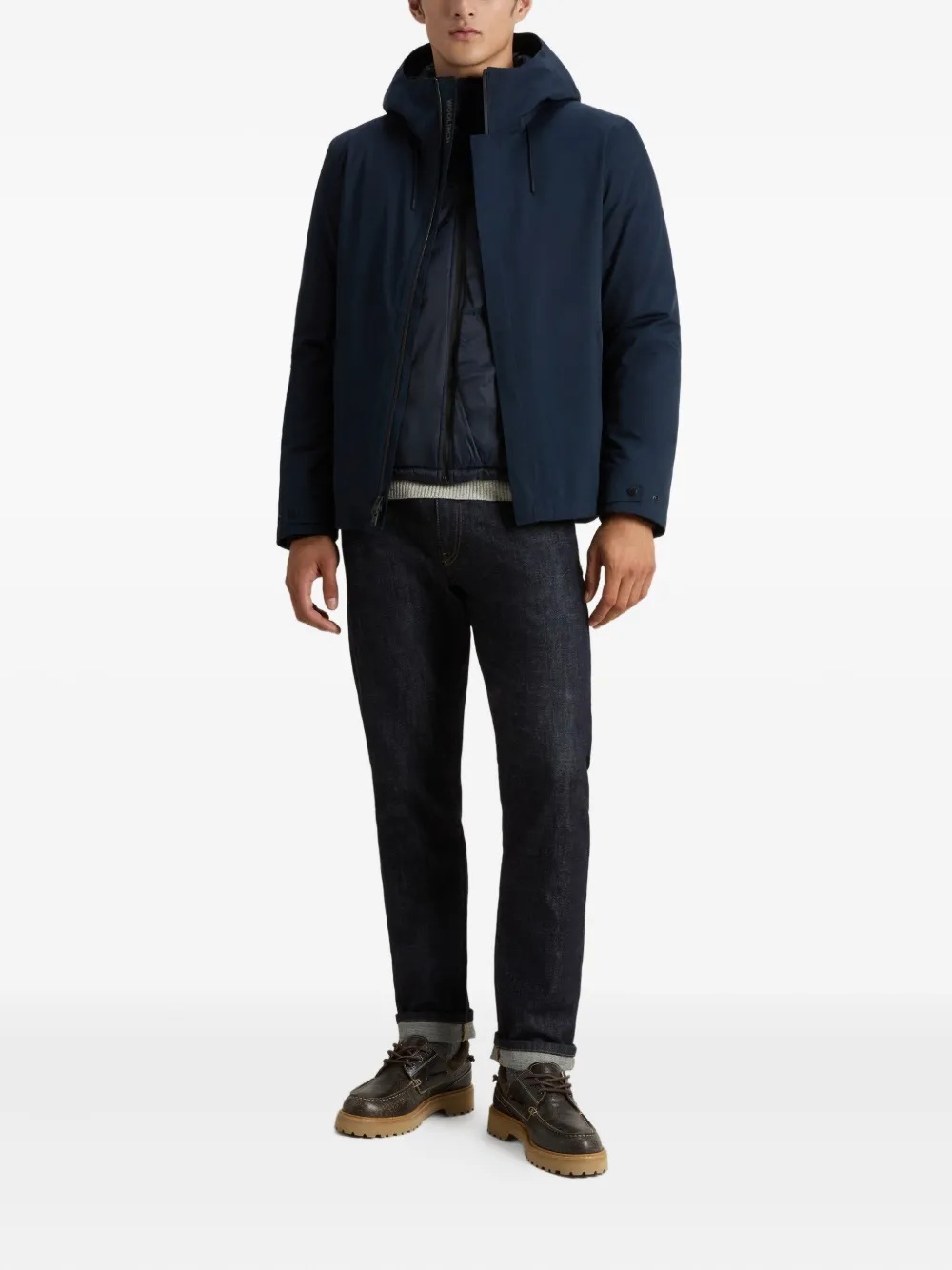 Синий капюшон, застежка-молния, прорезные карманы, регулируемые манжеты.