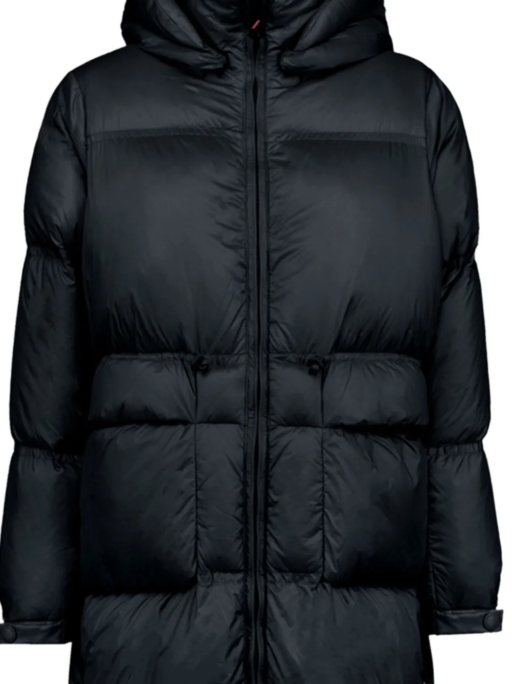 Черный стеганый дизайн, капюшон, завязка на талии, длинные рукава, застежка-молния спереди.