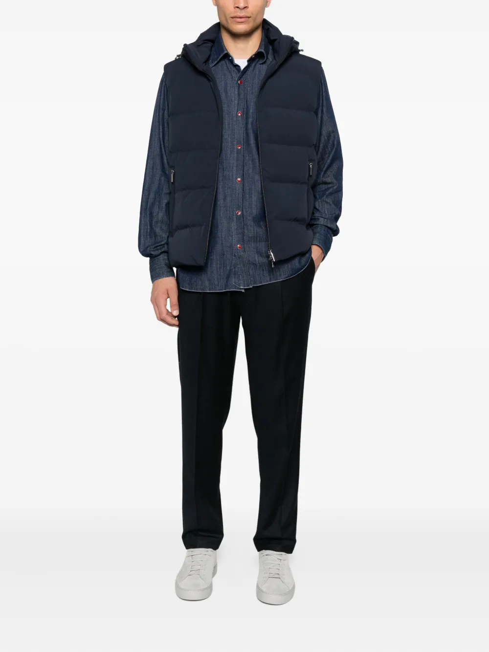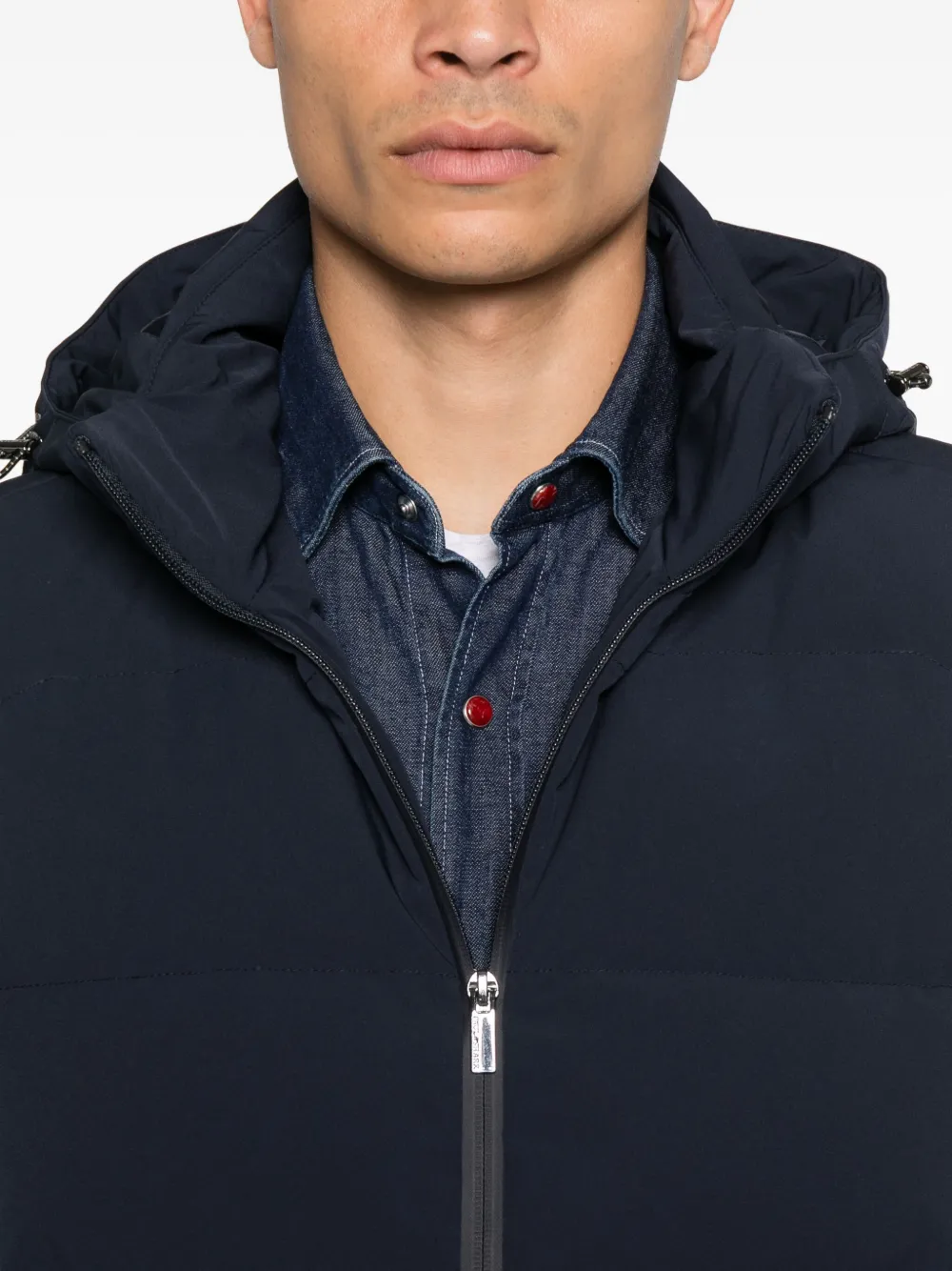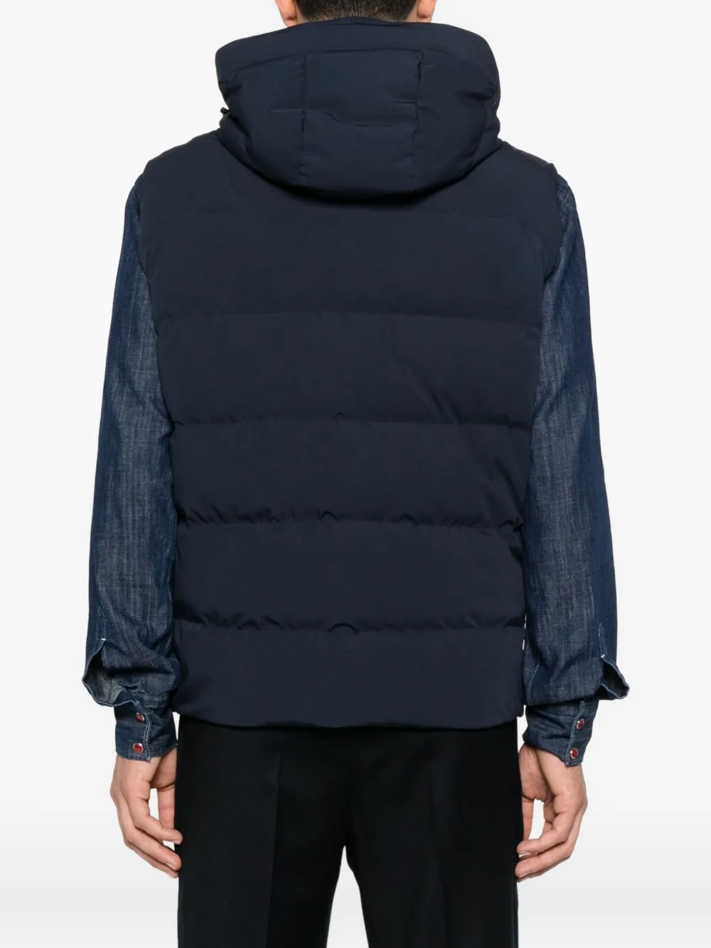 Темно-синий стеганый дизайн, застежка-молния, капюшон, вырез без рукавов, два кармана на молнии