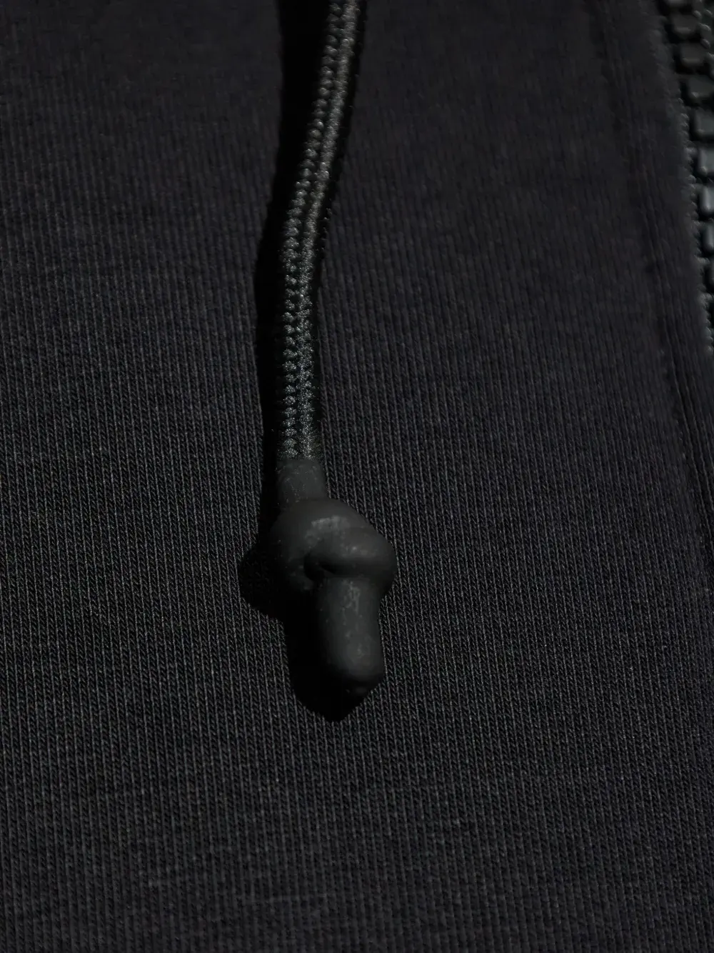 Черный хлопковый капюшон с застежкой-молнией, затягивающимся шнурком, вышитым логотипом и ребристыми манжетами.