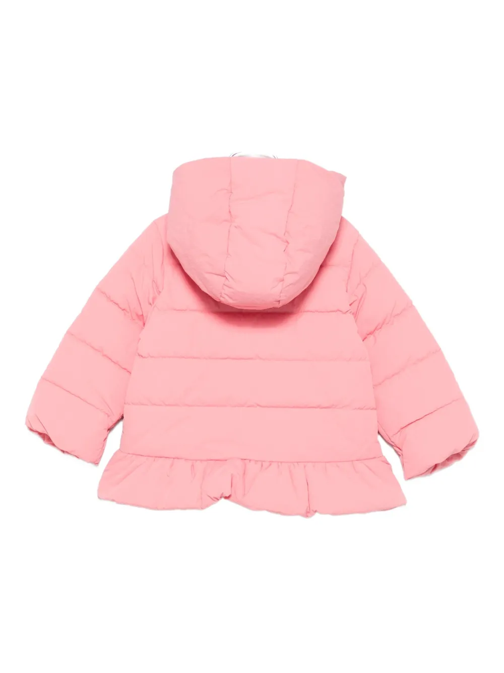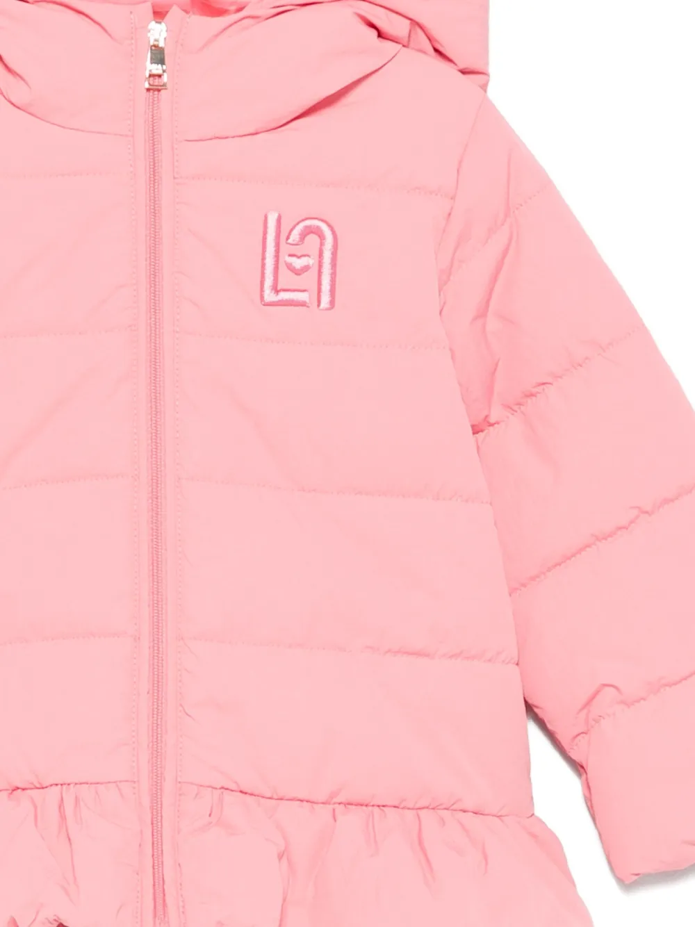 Стеганый дизайн розового цвета, оборчатый подол, застежка-молния, капюшон, вышитый логотип.