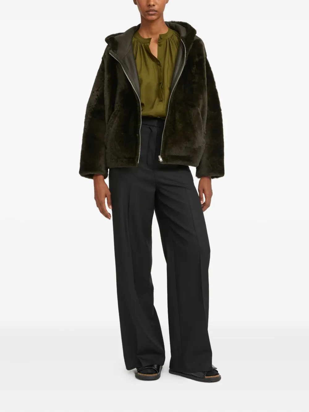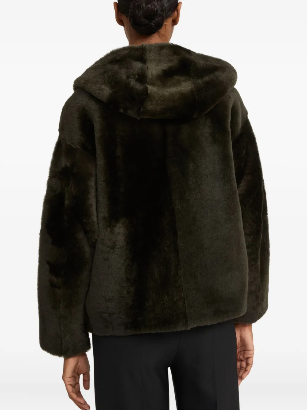 Темно-оливково-зеленая овчина, капюшон, застежка-молния спереди, длинные рукава, два прорезных кармана