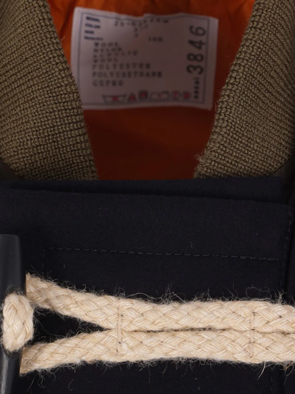 Темно-синяя шерстяная ткань, застежка-тогл, ремешки для крепления на веревке, капюшон, прорезные карманы
