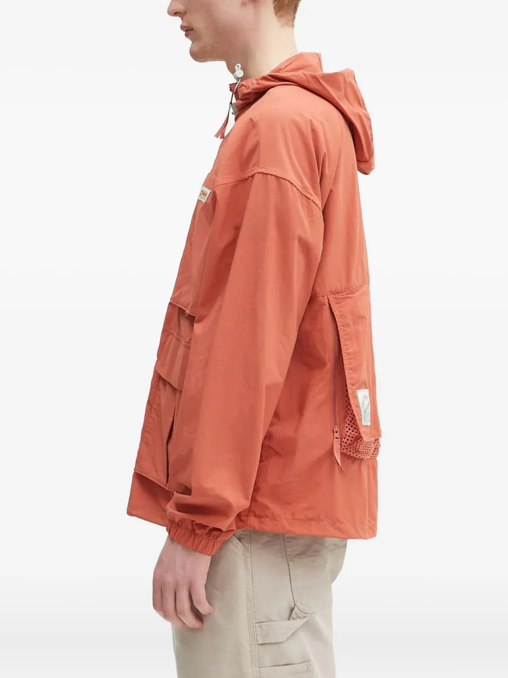 Оранжевая застежка-молния спереди, множество карманов, капюшон на шнурке, длинные рукава.