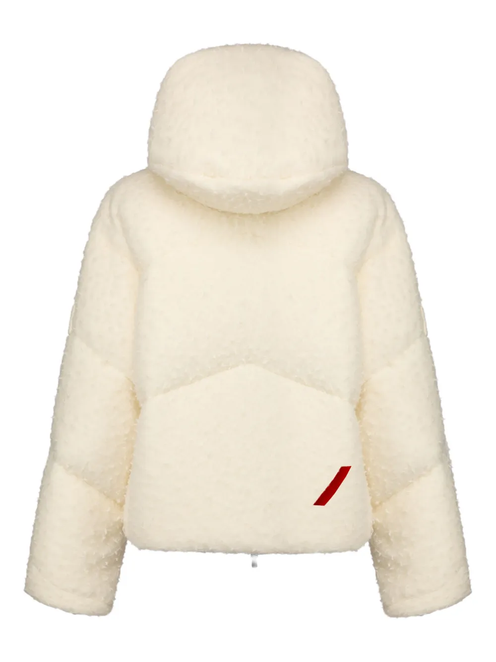 Стеганый свитер бежевого цвета с капюшоном, воротником-стойкой, потайной застежкой-молнией и нашивкой с логотипом.