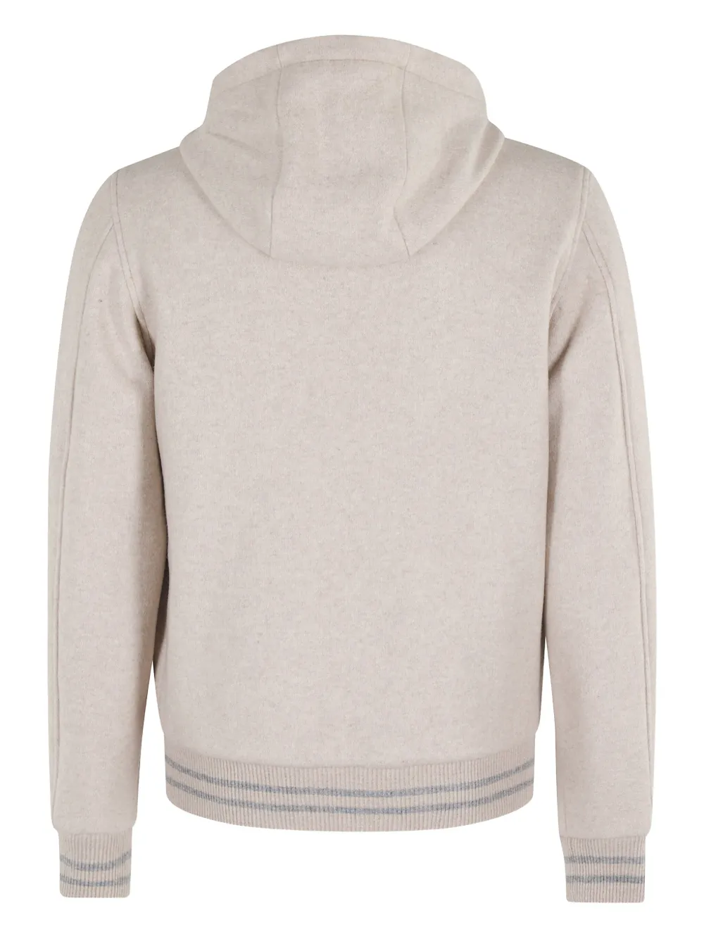 Бежевый шерстяной капюшон с завязками на шнурке, длинные рукава, центральная застежка-молния, ребристые манжеты и подол.