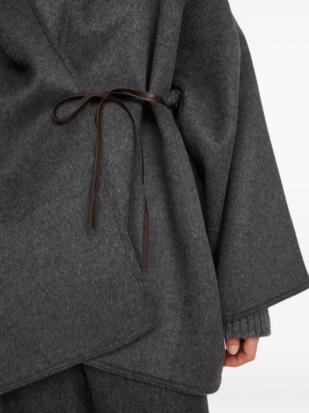 Темно-серый, с запахом спереди, завязывающийся на кожаном шнурке, капюшон, широкие рукава, двусторонняя шерстяная смесь