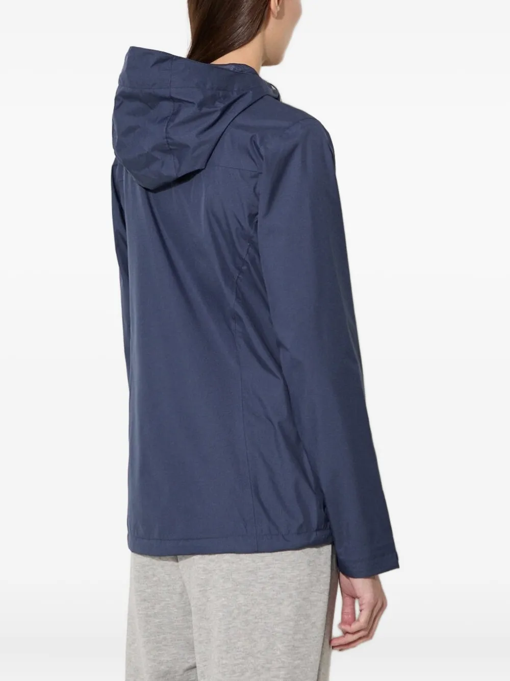 Темно-синяя застежка-молния спереди, капюшон, длинные рукава, регулируемые манжеты, логотип.