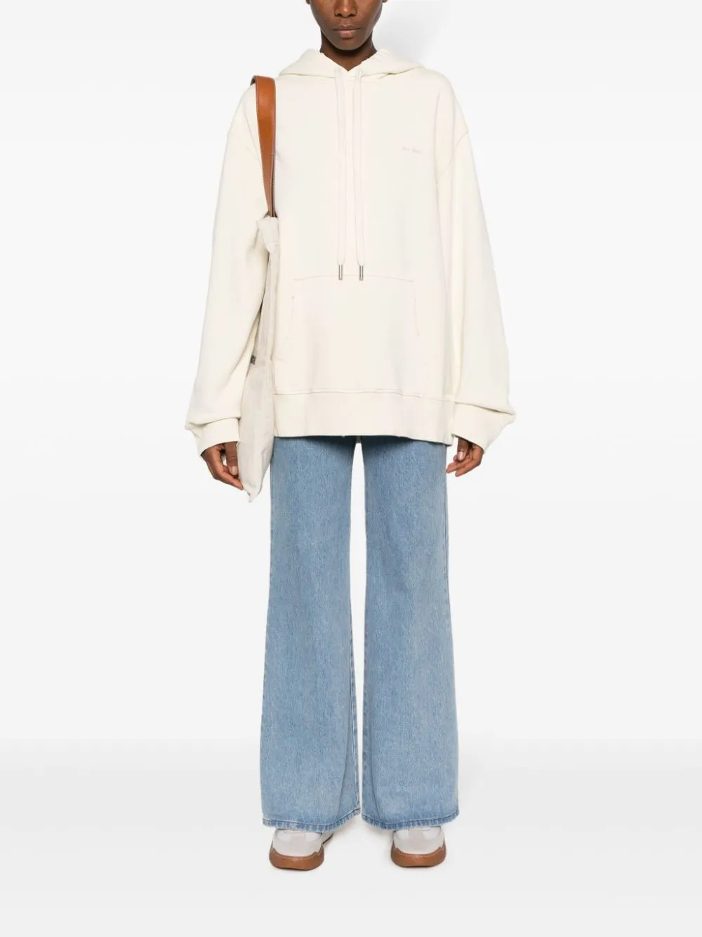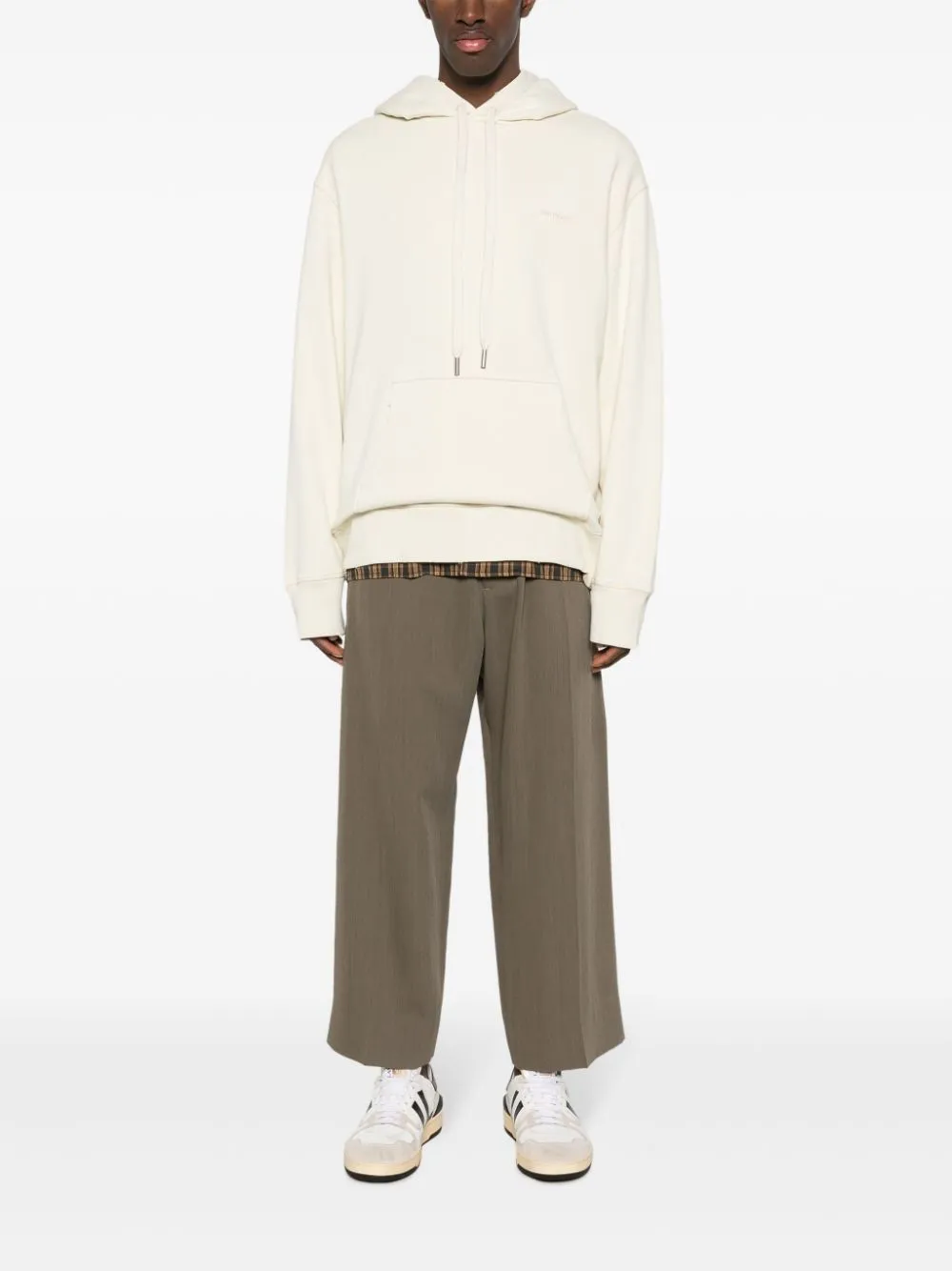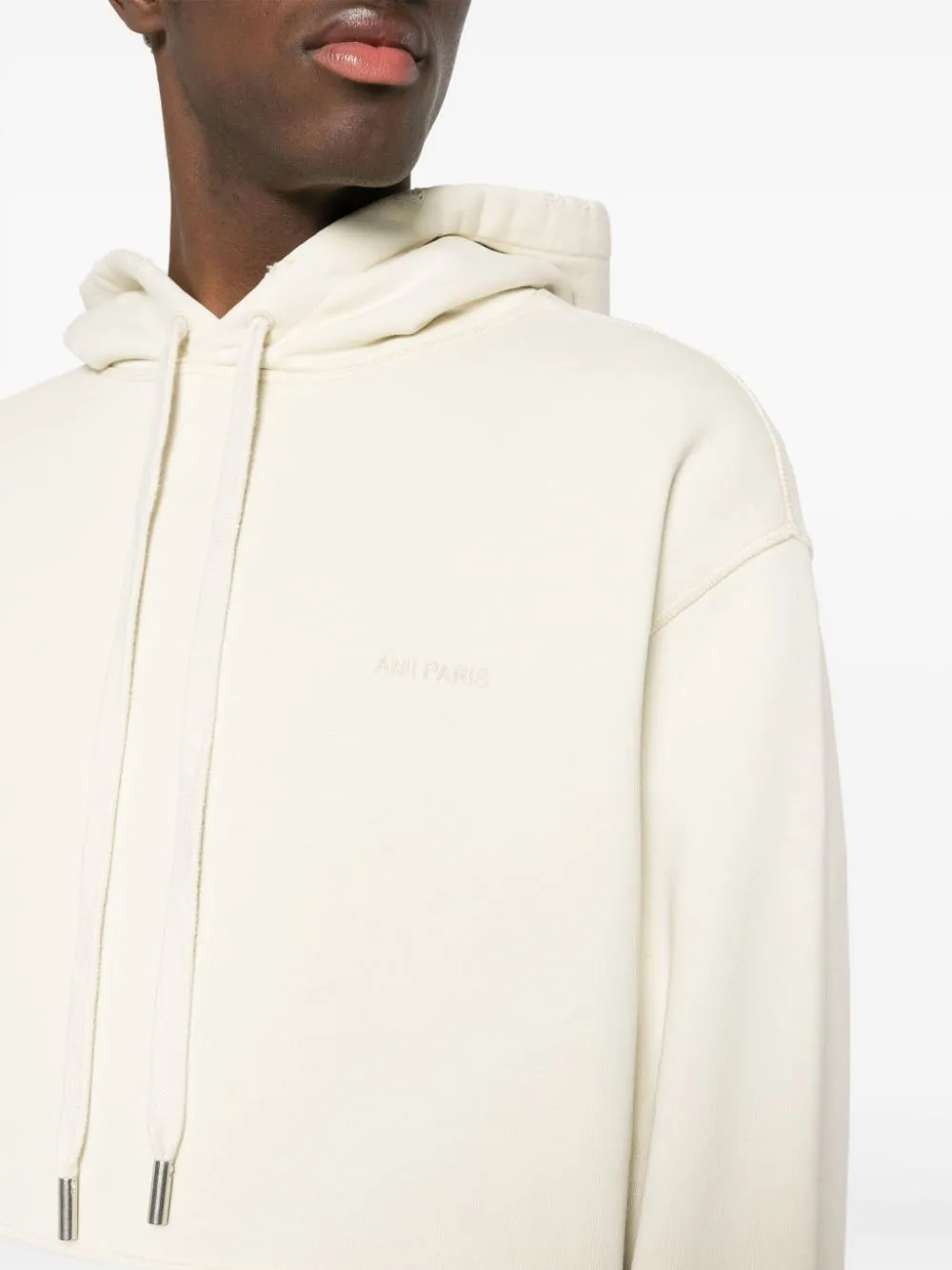 Цвет слоновой кости, хлопок, вышитый логотип на груди, затягивающийся на шнурок капюшон, длинные рукава и карман-муфта.