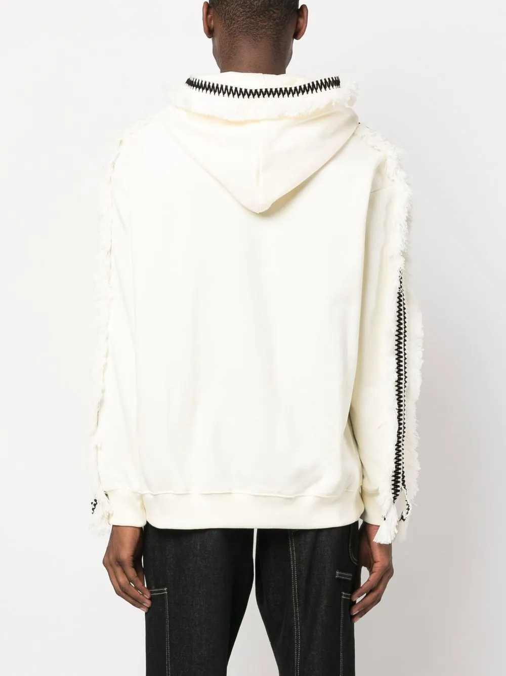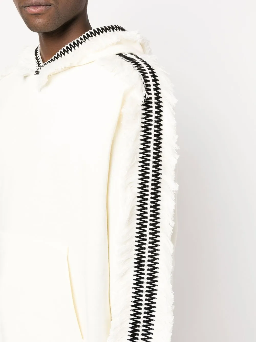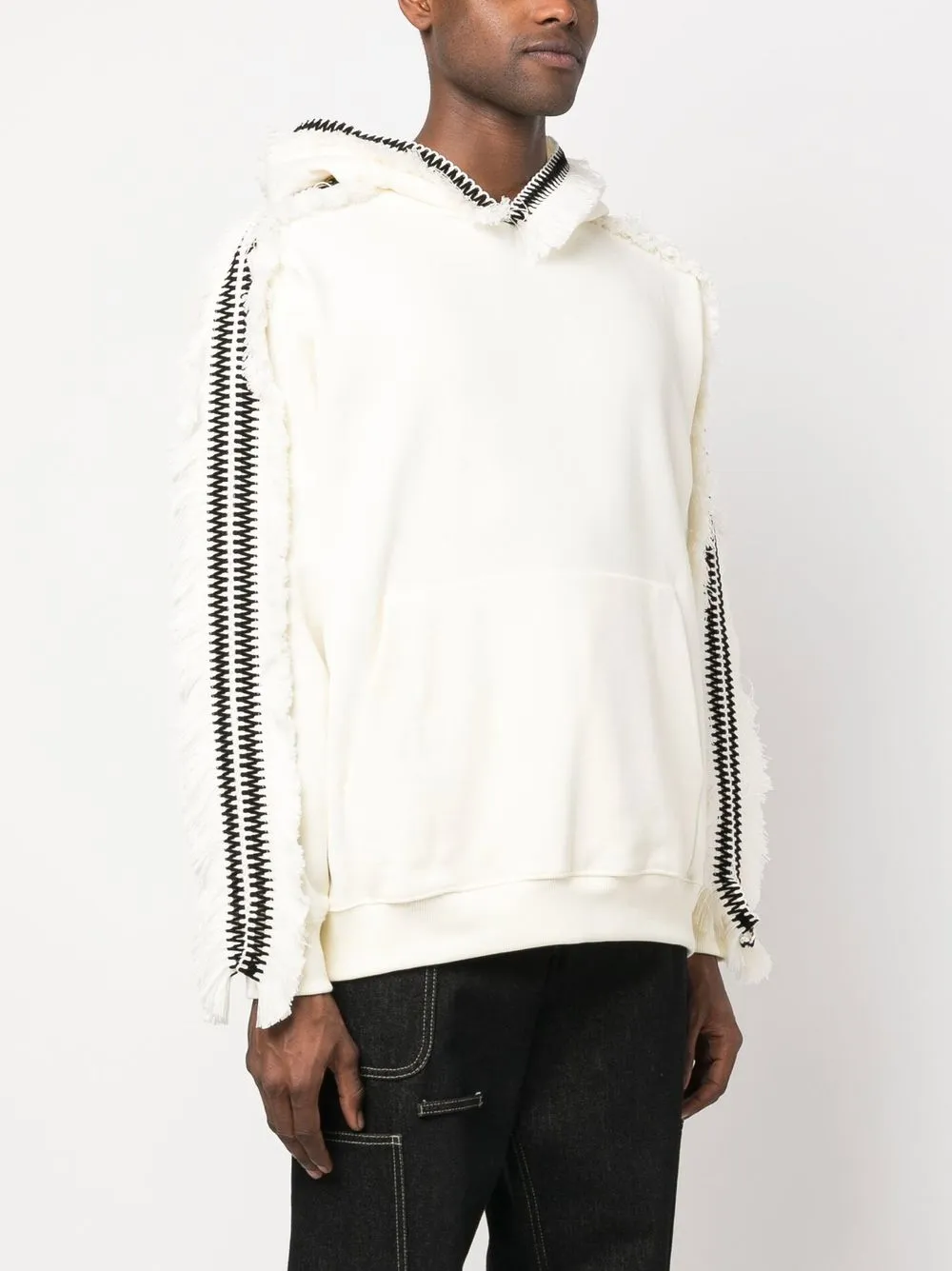 Белый/черный, хлопок, вышивка, края с бахромой, классический капюшон, длинные рукава и карман-муфта.