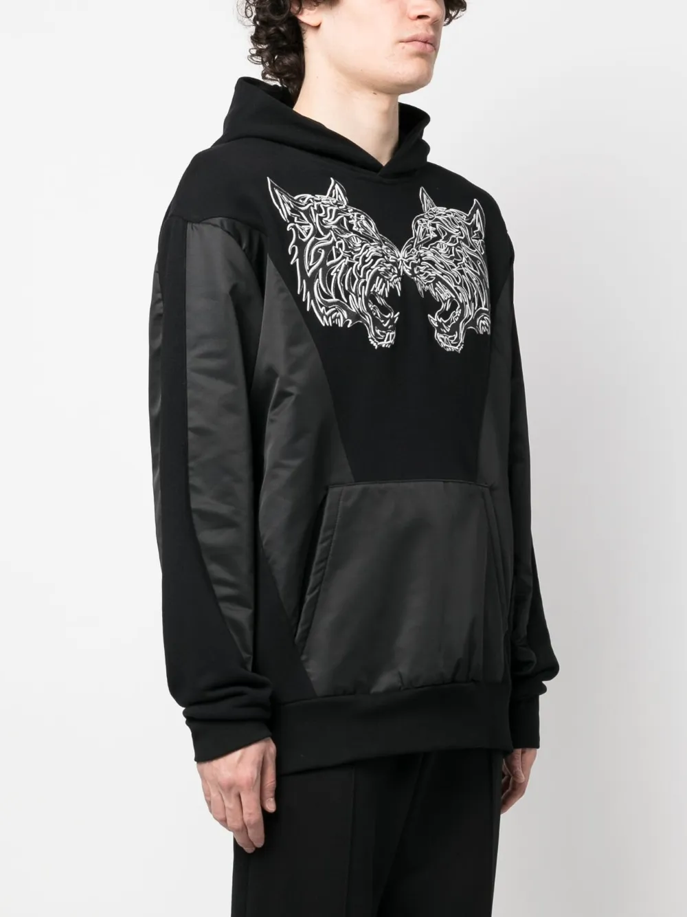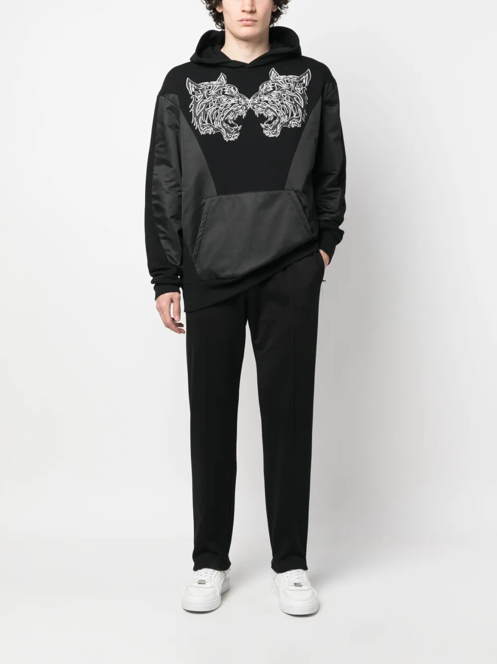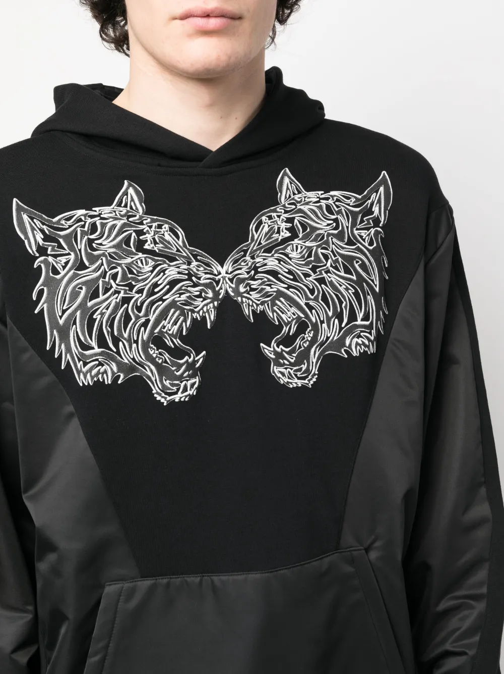 Черный, смесовый хлопок, принт с изображением тигра, вставки, принт с логотипом сзади, объемный капюшон, карман-муфта, длинные рукава, прямой подол, эластичные манжеты и эластичный подол.