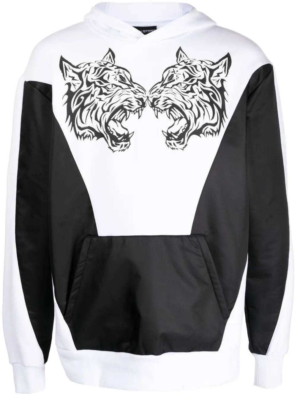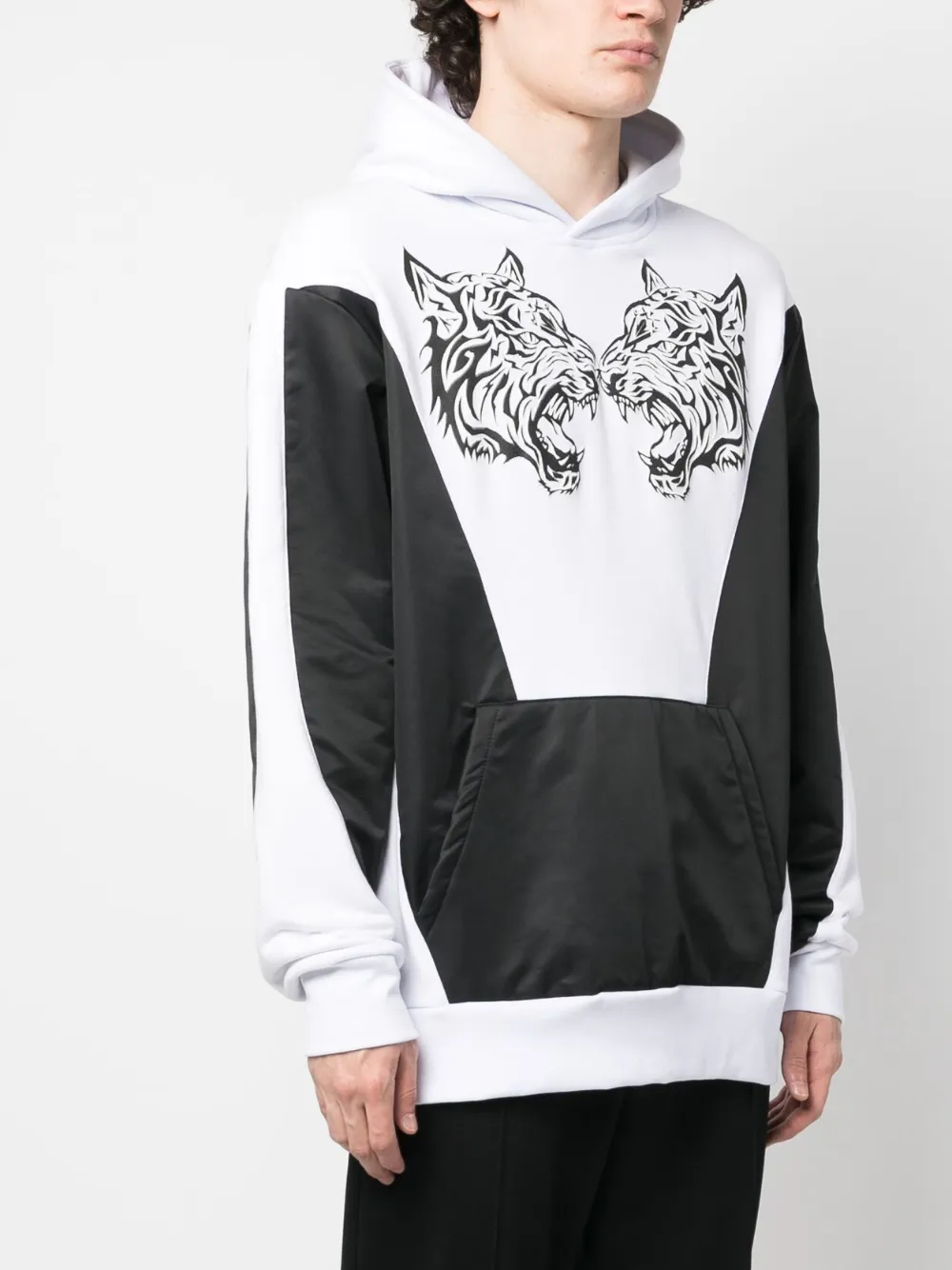 Черный/белый, смесовый хлопок, принт с изображением тигра, вставки, принт с логотипом сзади, объемный капюшон, карман-муфта, длинные рукава, прямой подол, эластичные манжеты и эластичный подол.
