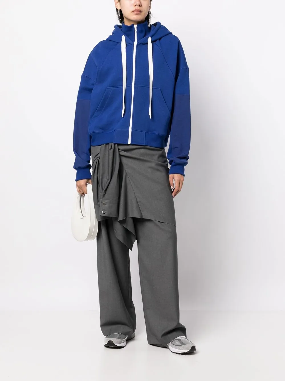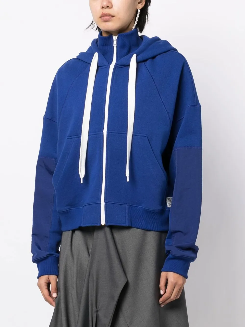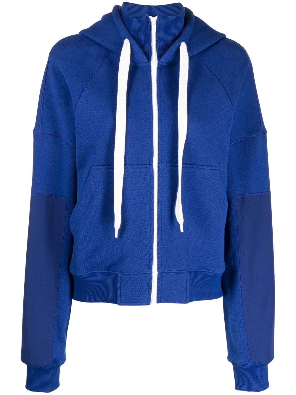 Кобальтово-синий, смесовый хлопок, детали в рубчик, нашивка с логотипом сбоку, объемный капюшон на шнурке, застежка на молнии спереди, длинные рукава, два передних кармана и прямой подол.