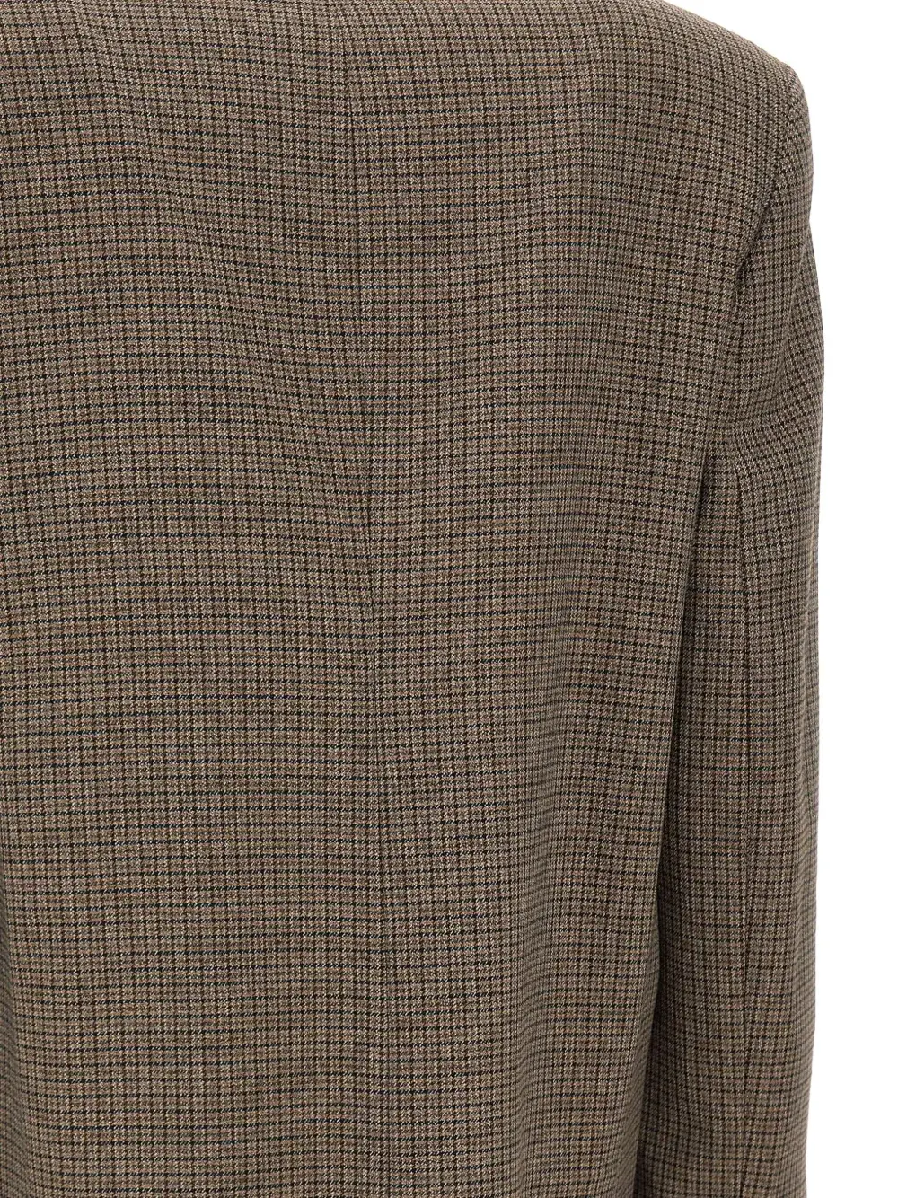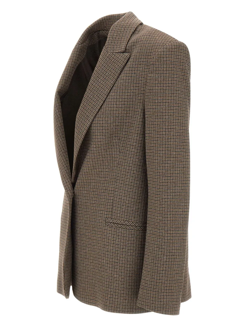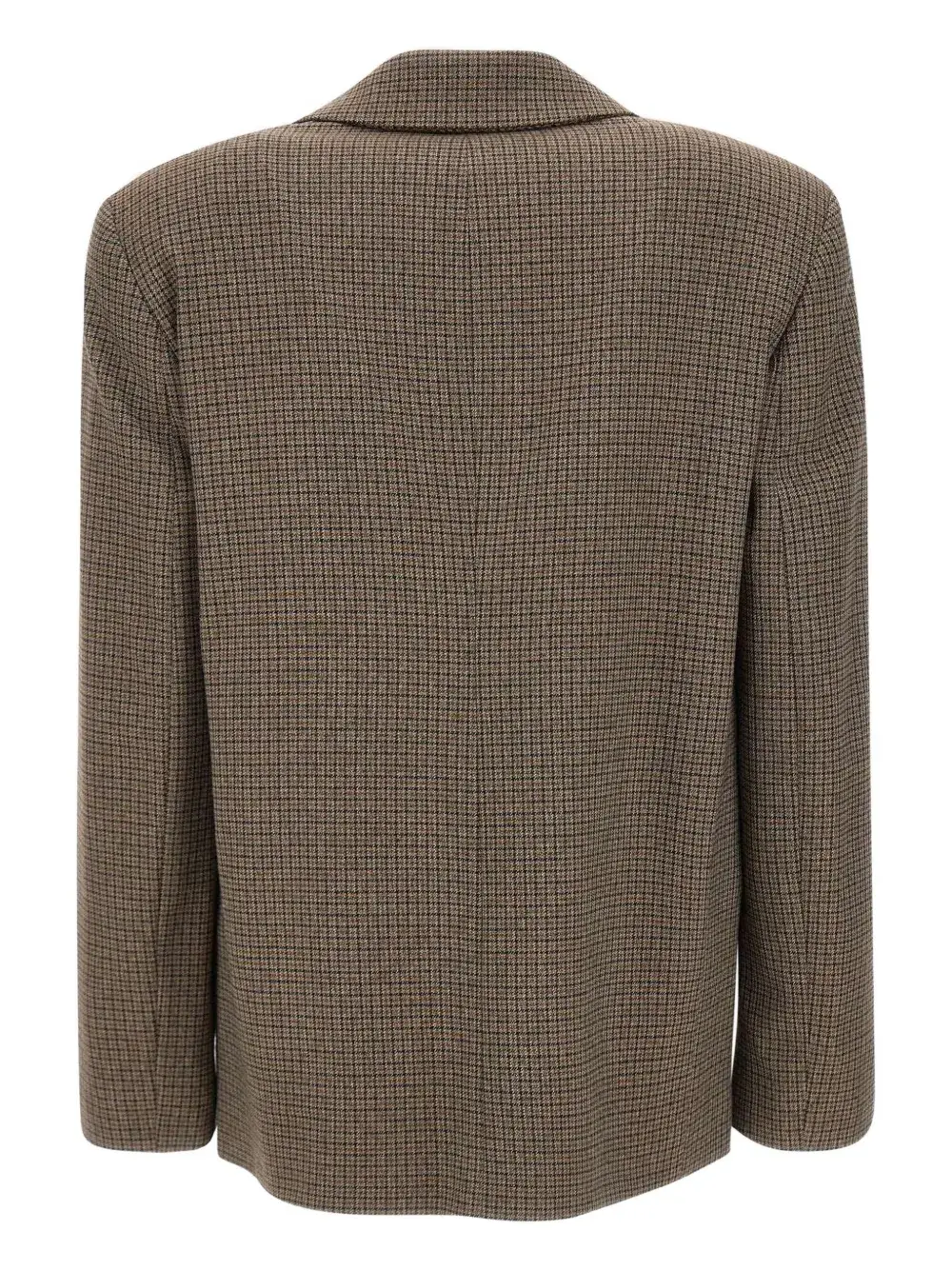 Коричневые отвороты в ломаную клетку, застежка на одну пуговицу, передние карманы, подбитые плечи