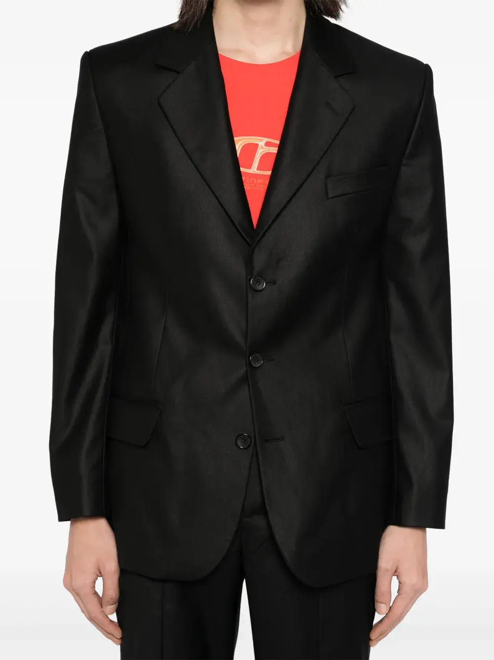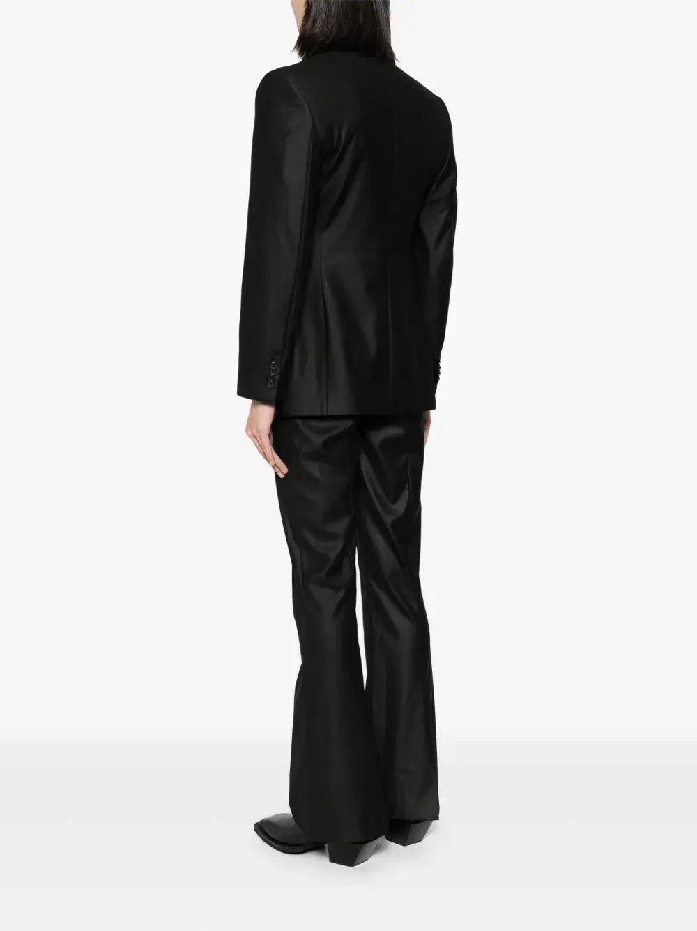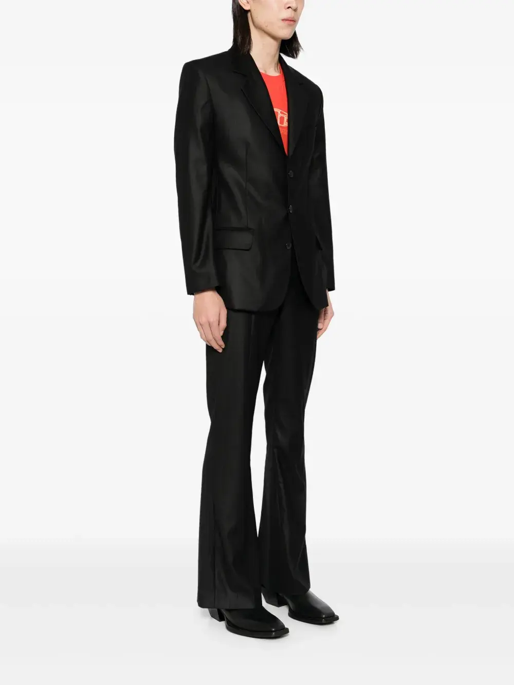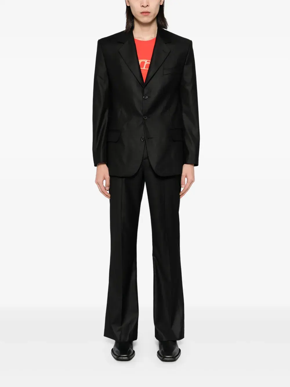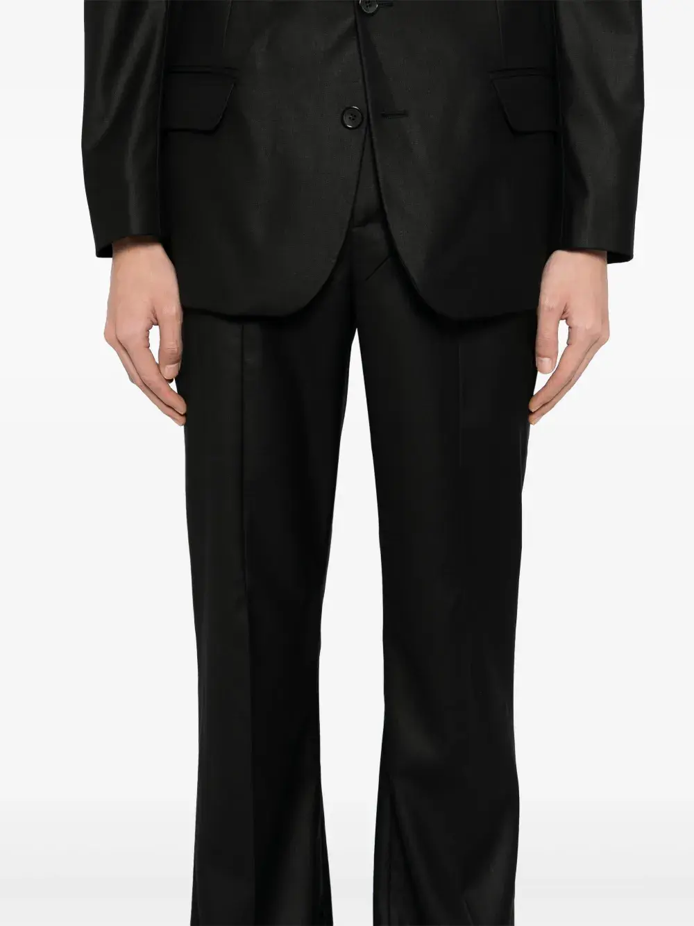 Подробнее о товаре: • Highlight: • черный • смесовая шерсть • Пиджак: • заостренные лацканы • длинные рукава • манжеты на пуговицах • прорезной карман на груди • два передних кармана с клапанами • внутренние прорезные карманы • застежка на пуговицах спереди • Брюки: • расклешенный подол • два кармана по бокам • дизайн со вставками • петли для ремня • потайная застежка на молнии и пуговицах • Это унисекс-модель. Обратите внимание, что для нее используется мужская размерная сетка.