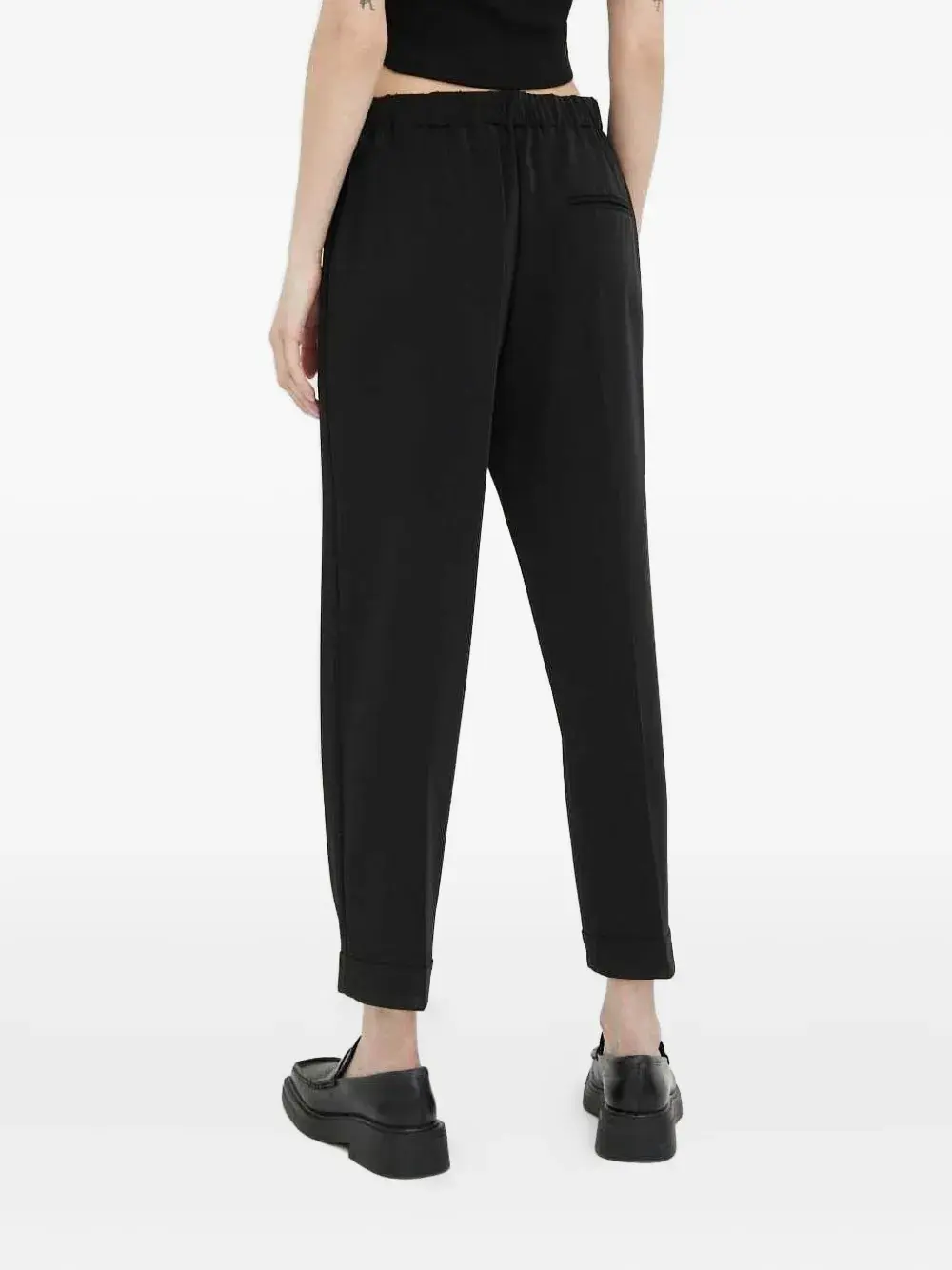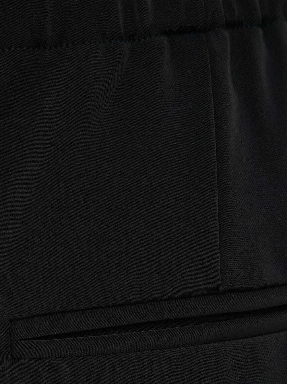 Черный эластичный пояс, зауженные штанины, прорезные карманы по бокам, прорезной карман сзади