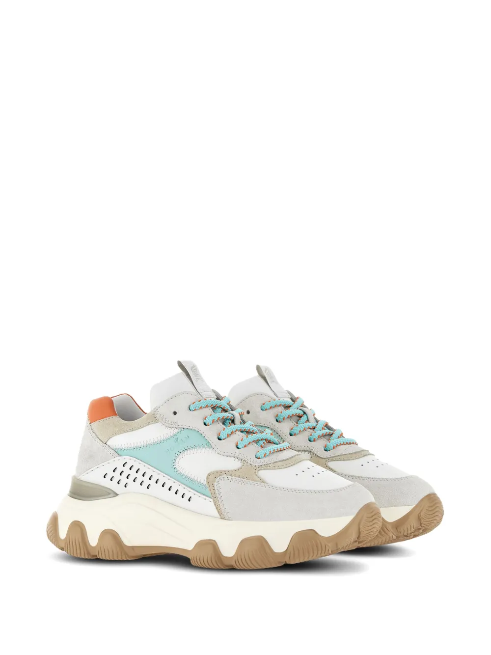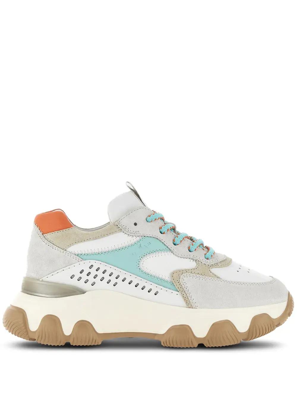 Белый/разноцветный, телячья кожа, замшевые вставки, перфорация, нашивка с логотипом на язычке, закругленный носок, шнуровка спереди и массивная резиновая подошва.