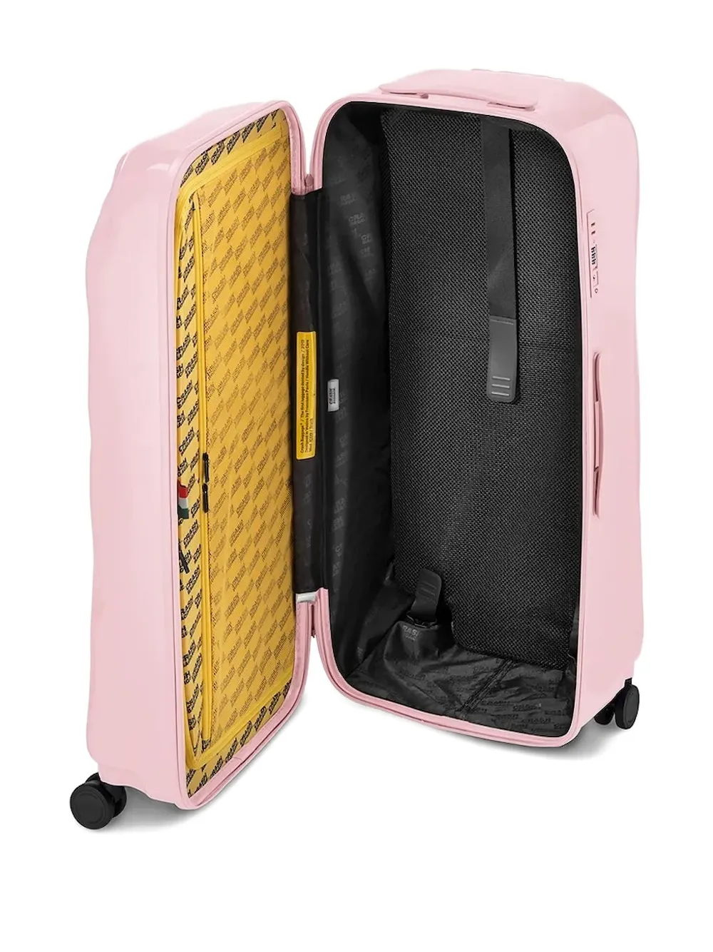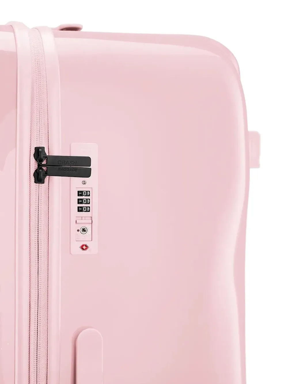 Розовый глянцевый корпус, выдвижная ручка, кодовый замок, четыре колеса