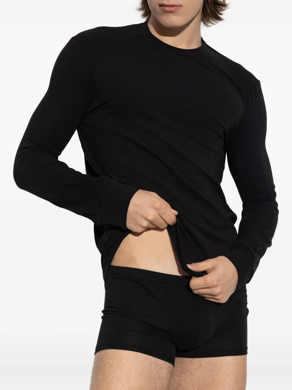 Черный, с длинными рукавами и круглым вырезом, с логотипом сзади.