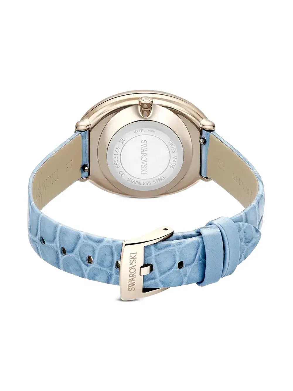 Светло-голубой кожаный ремешок диаметром 37 мм, овальный корпус, циферблат со стеклянным циферблатом, швейцарский механизм.