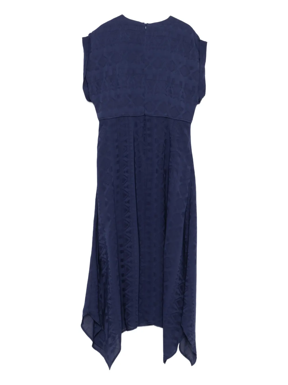 Темно-синий геометрический узор, короткие рукава, асимметричный подол.